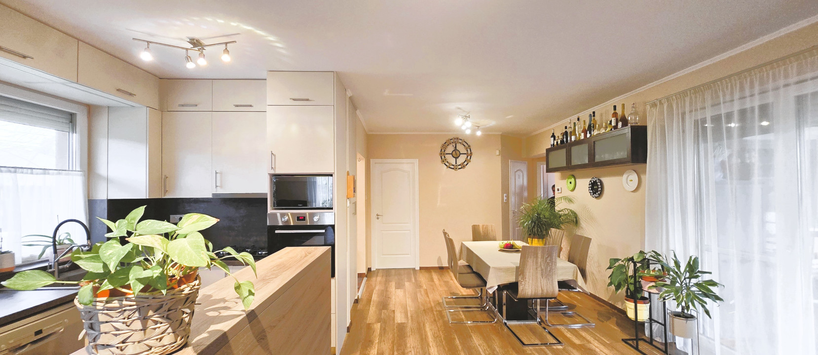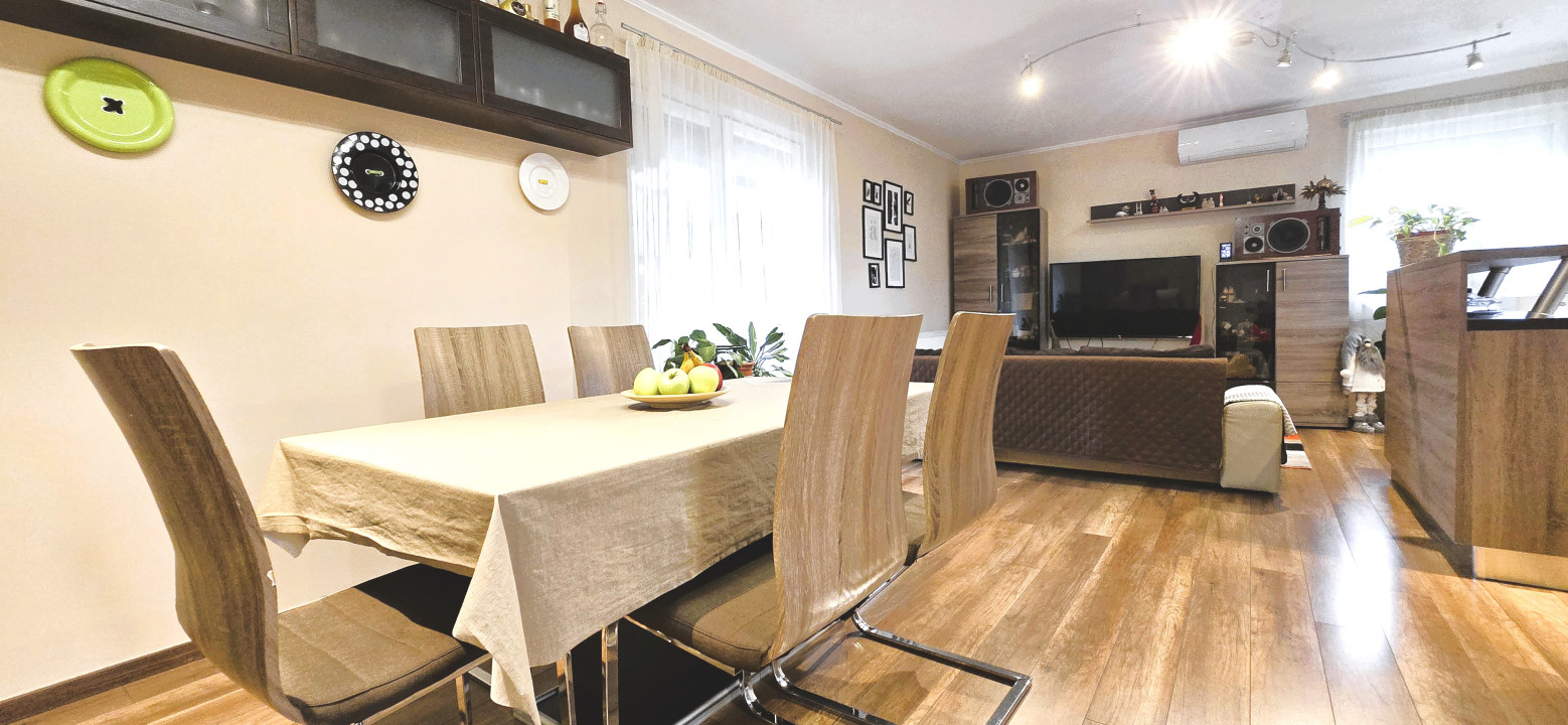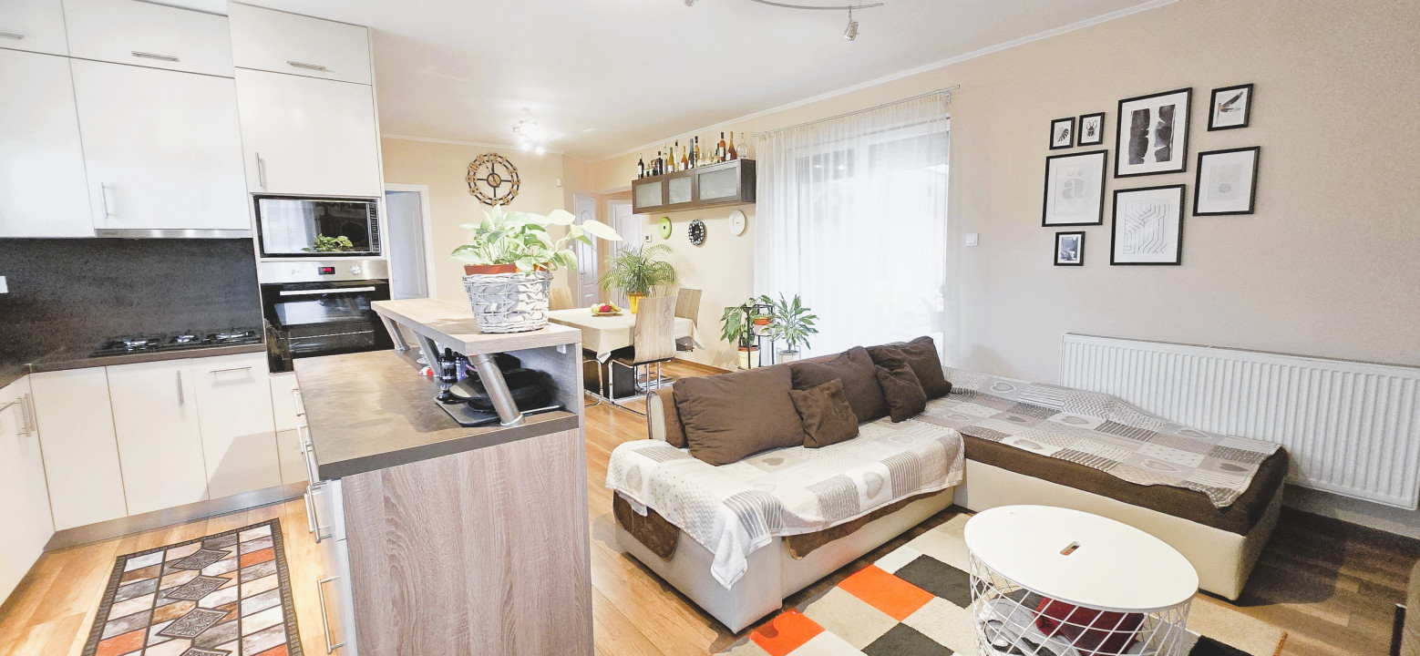 Központi része a háznak a nappali-étkező–konyha ( 38 m2 ), vadonatúj konyhabútorral, mely a vételár részét képezi. Három hálószoba nyílik a közlekedőből (8,1 ; 9,6 és 10,7 m2)