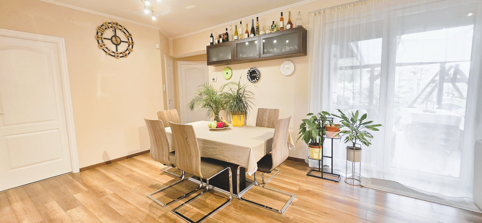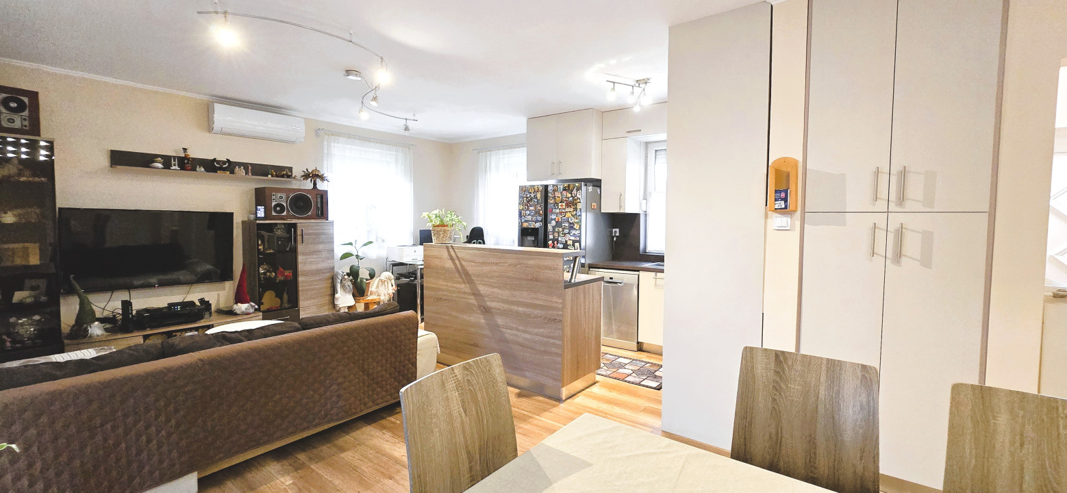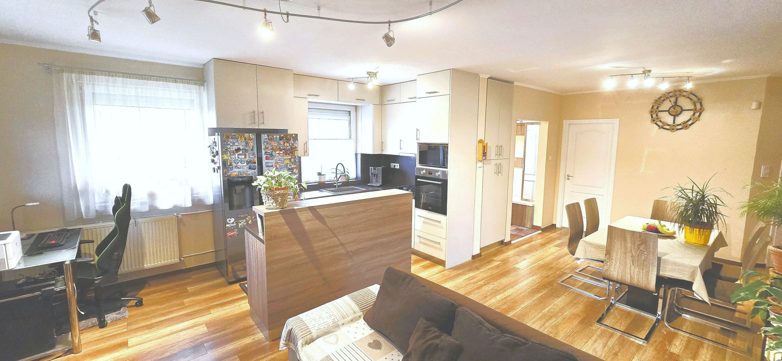 Központi része a háznak a nappali-étkező–konyha ( 38 m2 ), vadonatúj konyhabútorral, mely a vételár részét képezi. Három hálószoba nyílik a közlekedőből (8,1 ; 9,6 és 10,7 m2)