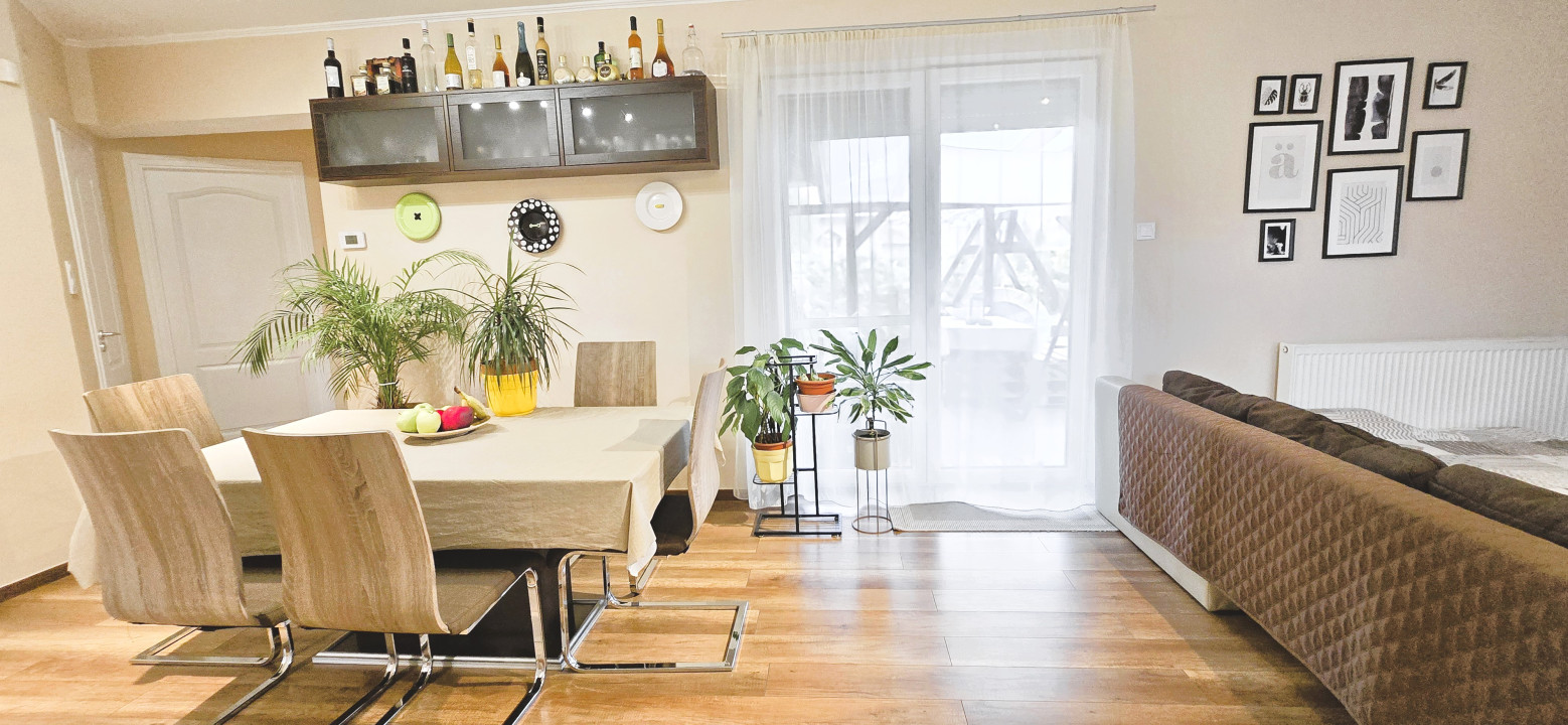 A nappali és a terasz tájolása DNY-i , az ingatlan belmagassága 2,6 m