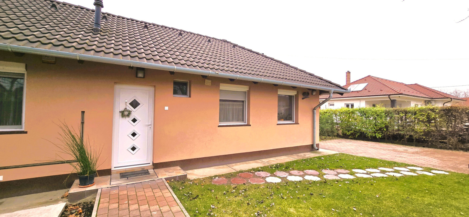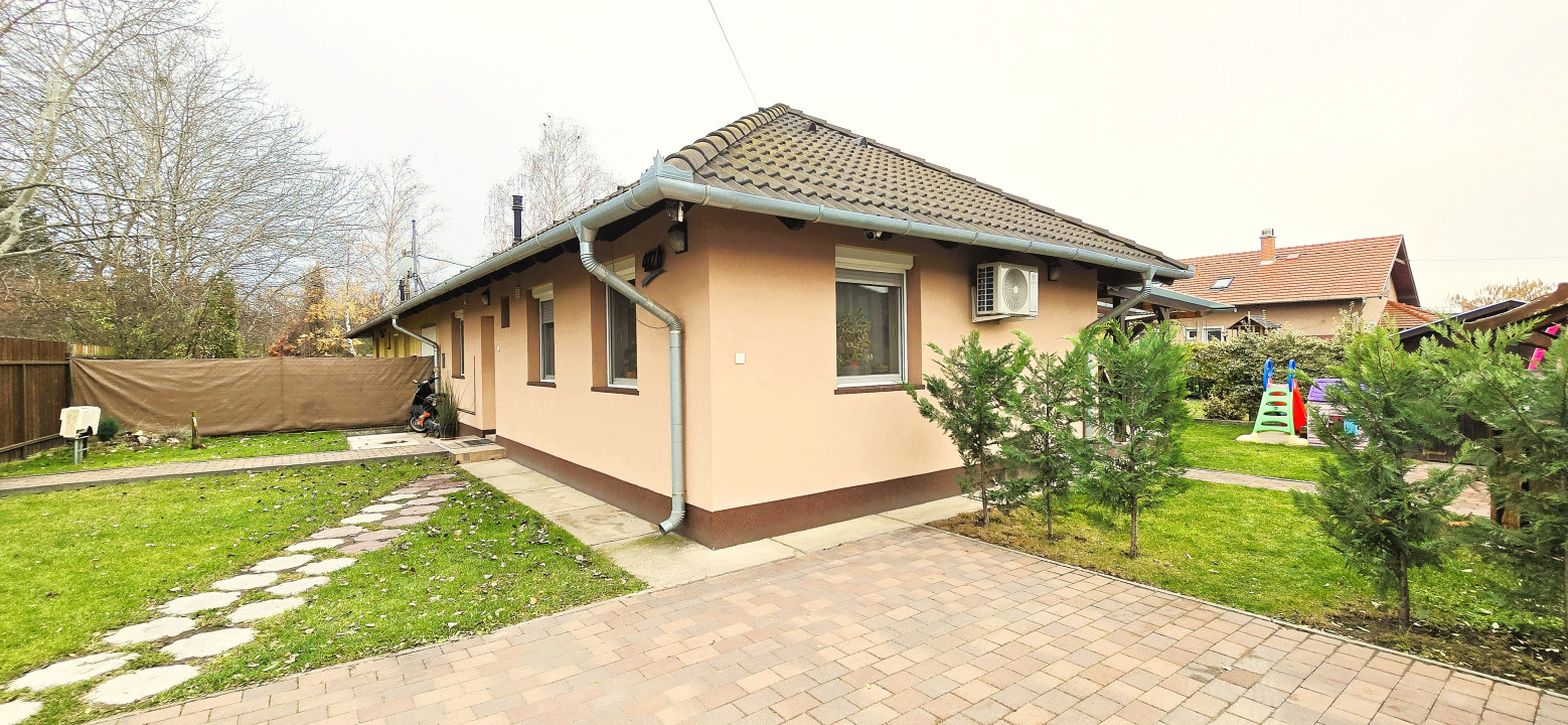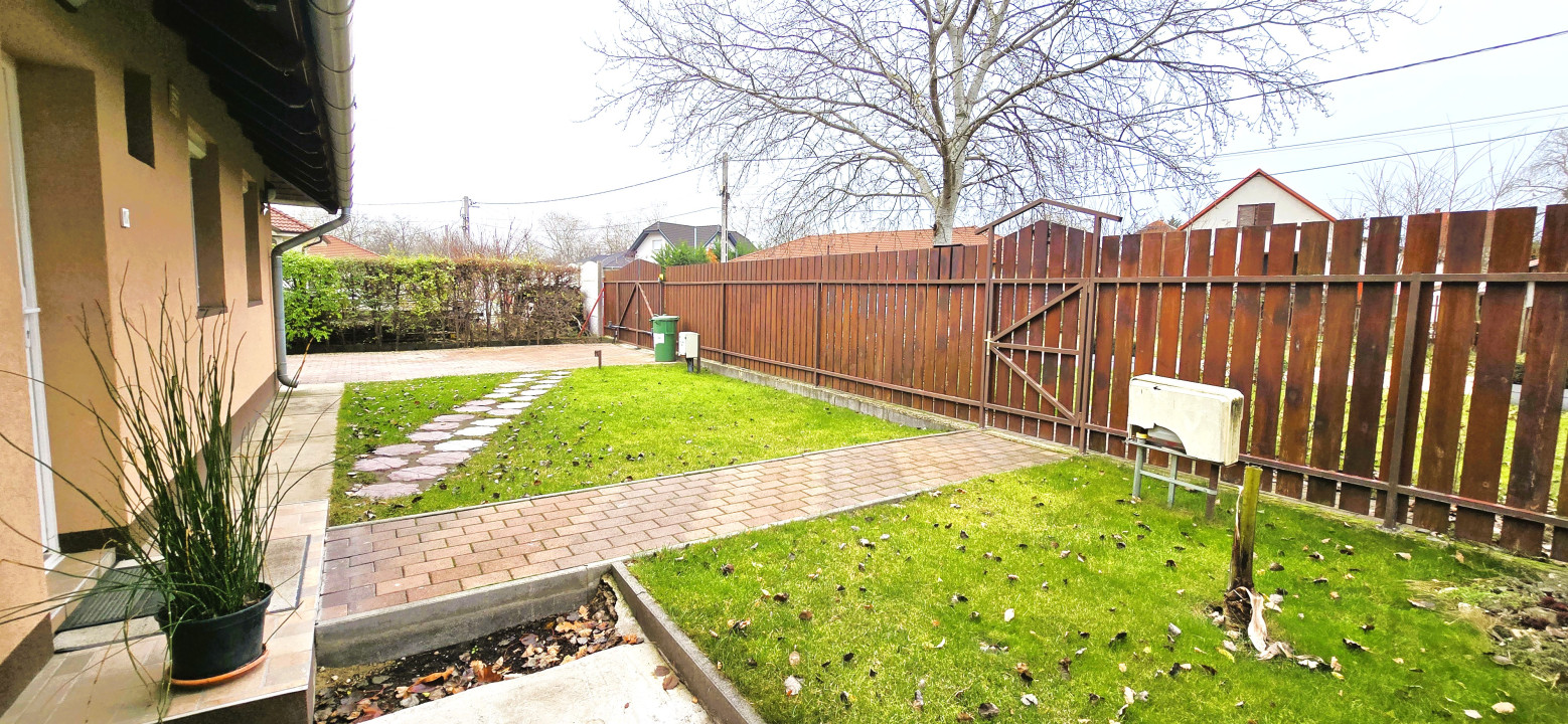 A ház előtt található kert füvesített, ahol két autó számára van kialakítva térkövezett parkolási lehetőség, utcafrontról motorizált kapunyitással. Locsolás fúrt kútról megoldott.