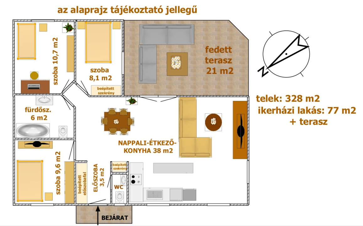 Az ikerház alapterülete: nettó 77 m2; fedett terasz: 21 m2