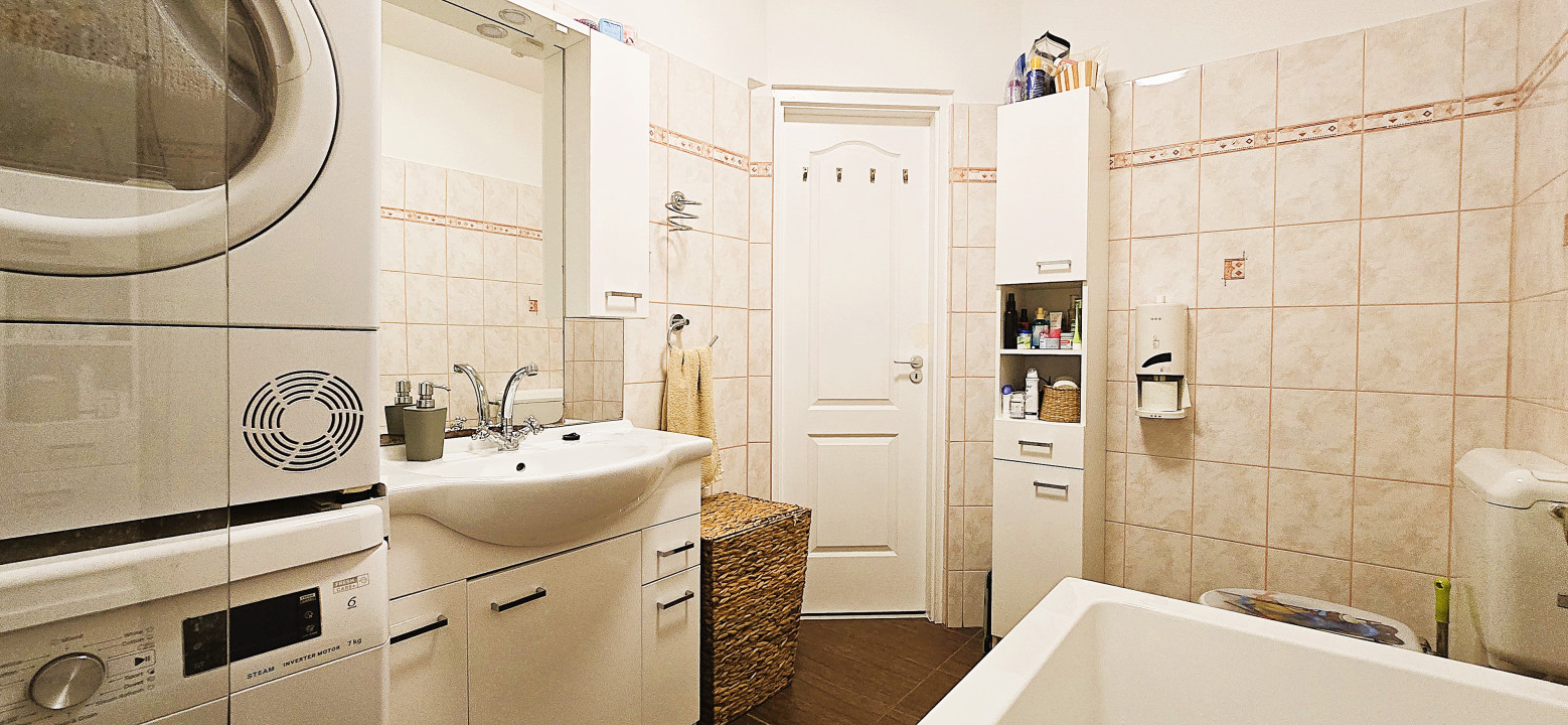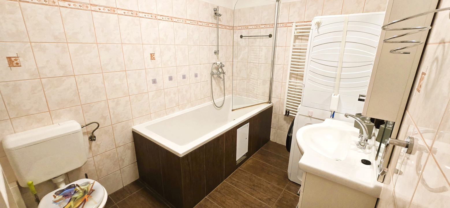 Fürdőszoba káddal, mosdókagylóval, wc -vel felszerelt (6 m2), valamint a közlekedőből nyílik egy külön helységben található wc kézmosóval