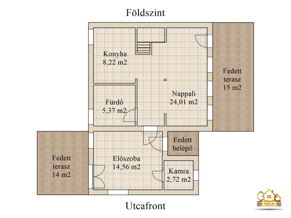 A 3 szintes épület 1990-ben épült könnyűszerkezetes építési móddal (betonyp). A földszinten található egy tágas előszoba, egy kamra, egy konyha-étkező- nappali és egy fürdőszoba. Az előszobából egy 14 -es fedett teraszra jutunk, ami a hátsó kertrészre néz.