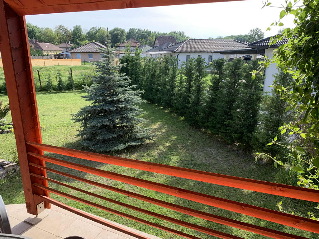 A hangulatos 21 m²-es teraszról a gondosan ápolt, 597 m²-es kertre nyílik kilátás, ahol a tuják és dísznövények békés, otthonos környezetet teremtenek.