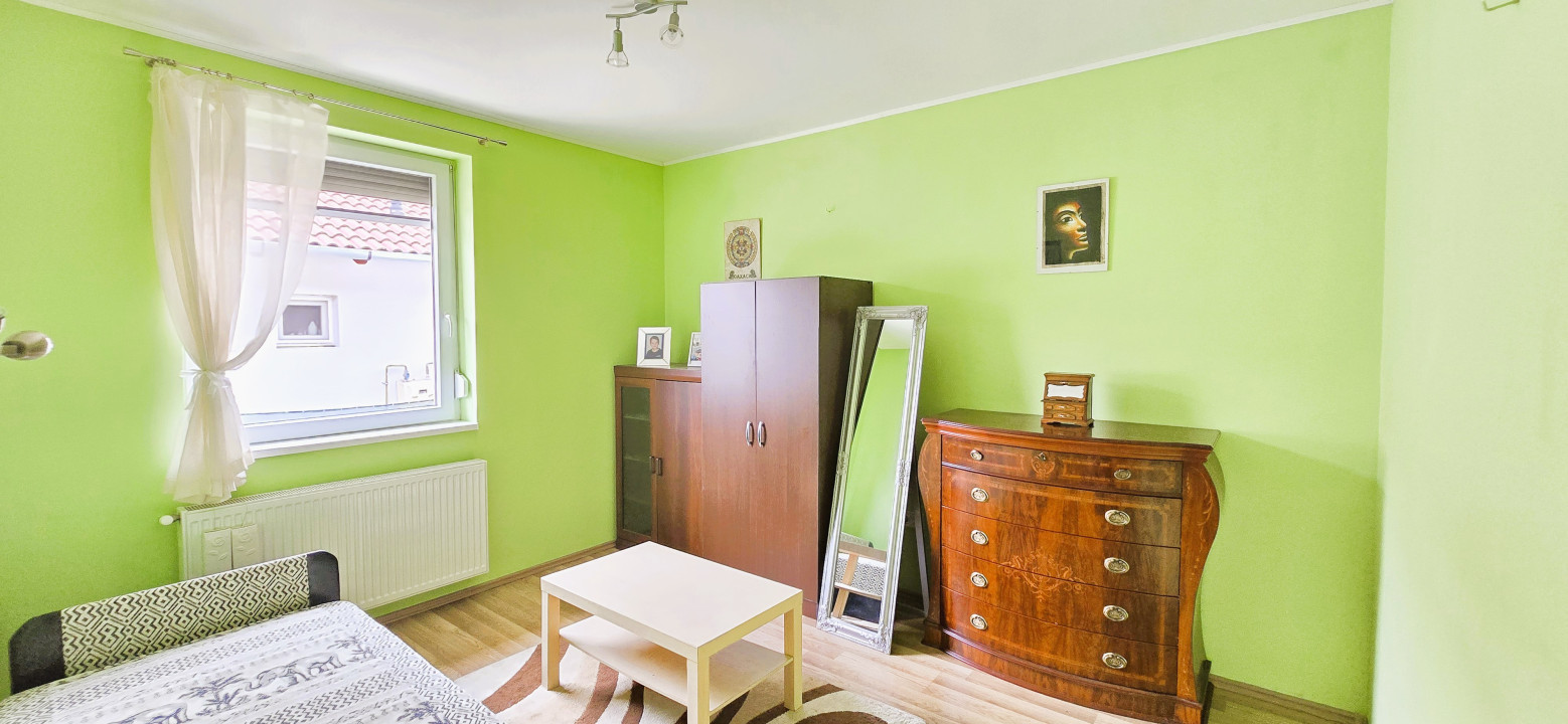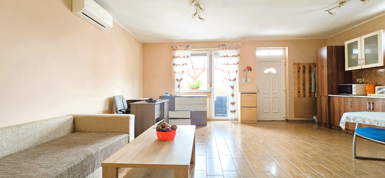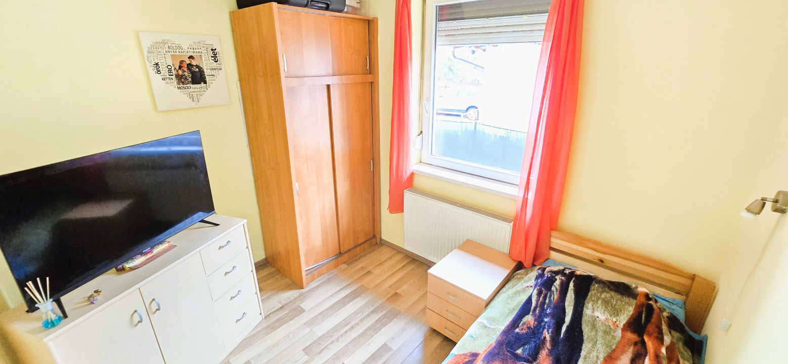 Központi része a háznak a nappali-étkező–konyha, konyhabútorral, mely a vételár részét képezi. Két hálószoba nyílik a közlekedőből (11,5 és 8 m2)