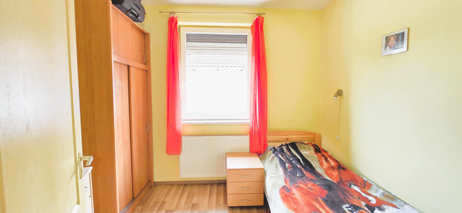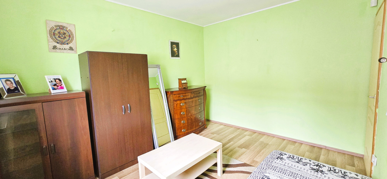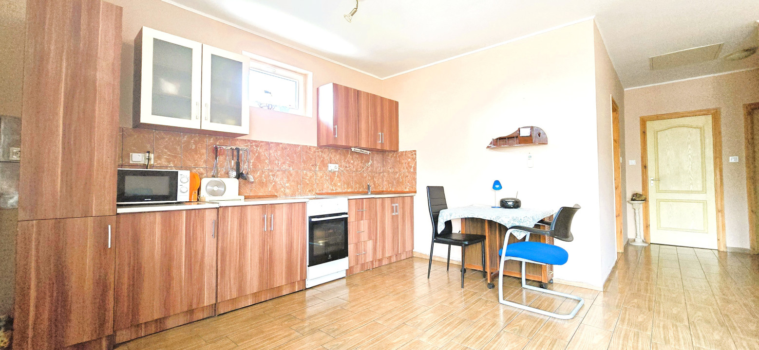 Központi része a háznak a nappali-étkező–konyha, konyhabútorral, mely a vételár részét képezi. Két hálószoba nyílik a közlekedőből (11,5 és 8 m2)