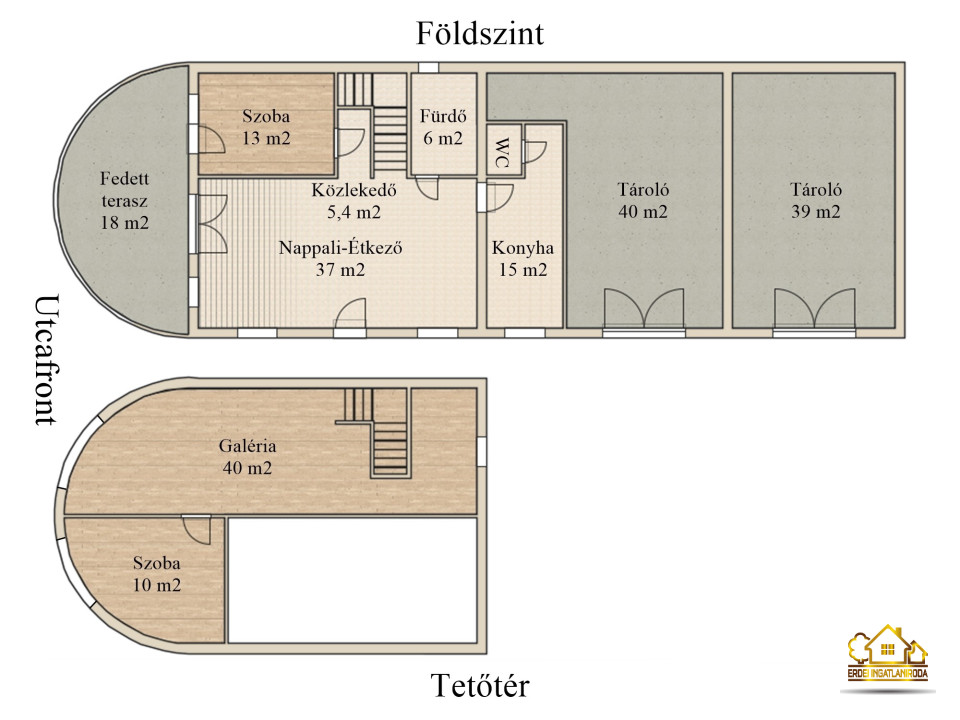A földszinten egy nappali-étkező, konyha, fürdő, külön toalett és egy hálószoba került kialakításra. A nappaliból és a hálószobából nyíló kényelmes 18 m2-es fedett teraszon tudunk pihenni.