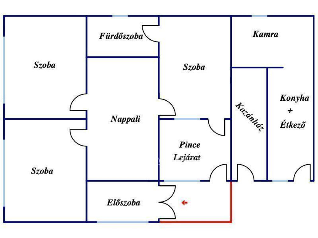 A házban 3 szoba + nappali, továbbá konyha, fürdőszoba, előszoba és praktikus kamra kapott helyet, így kényelmes otthont biztosít akár nagyobb család számára is.