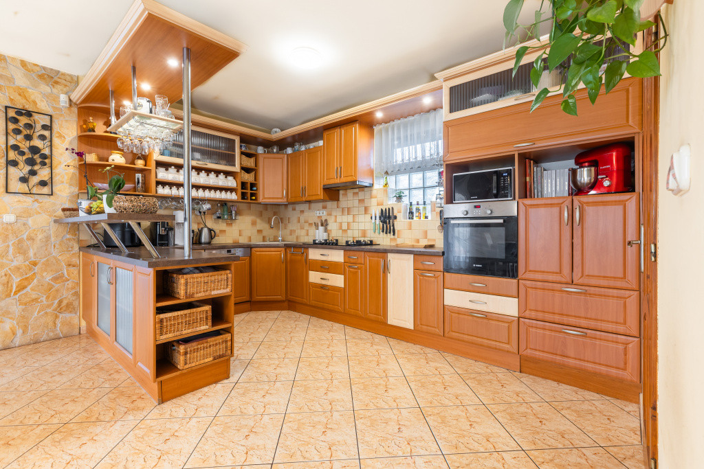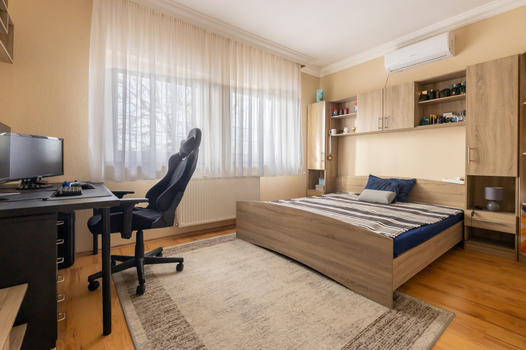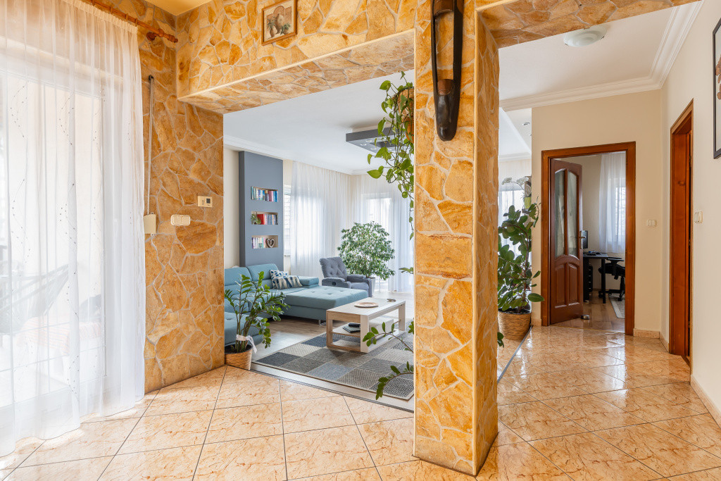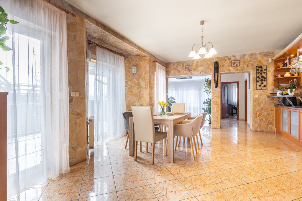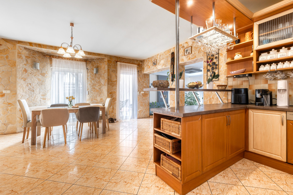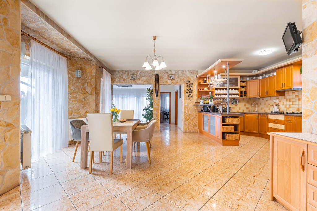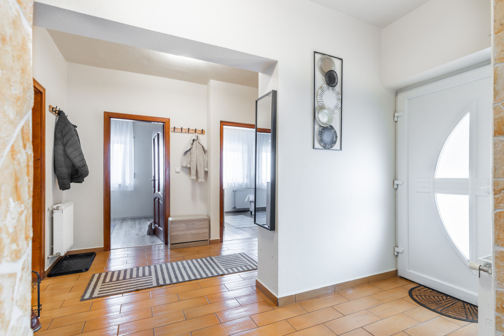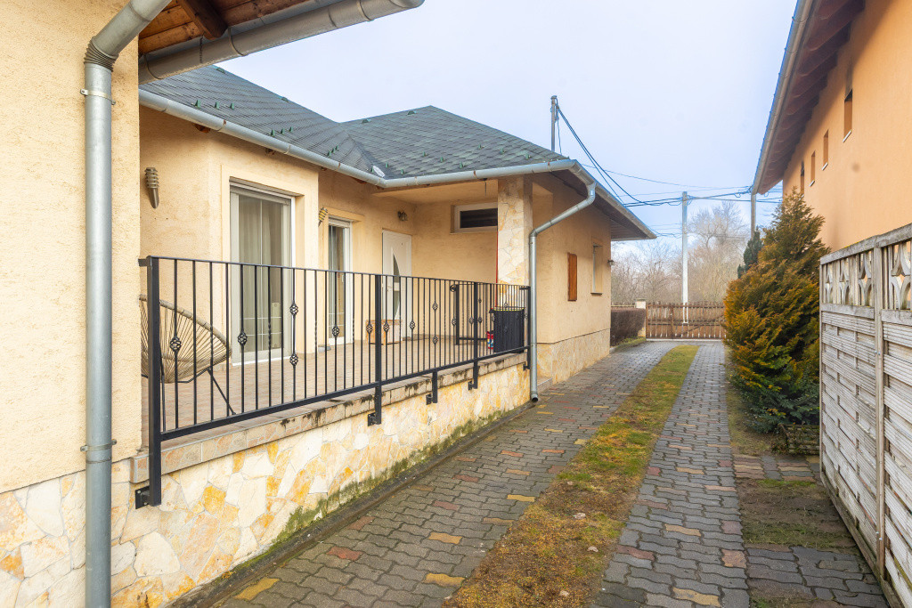 A belső elrendezés ideális családok számára: három külön nyíló szoba mellett tágas nappali és étkezős konyha alkotja a közösségi tereket, a kényelmet pedig két fürdőszoba, egy külön mellékhelyiség, kamra és gardrób növeli. A biztonságról riasztórendszer gondoskodik. Az udvaron garázs is található, valamint egy fúrt kút segíti a kert gazdaságos öntözését.