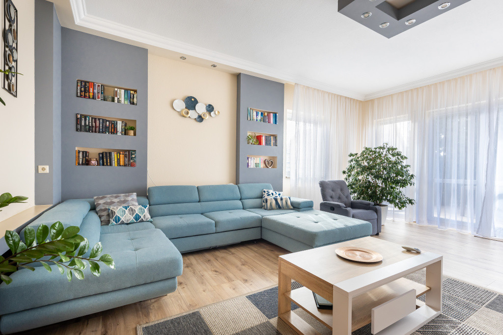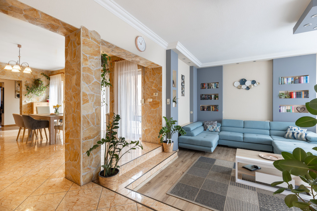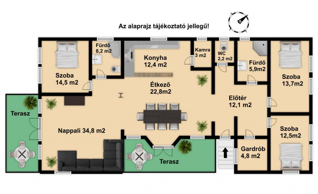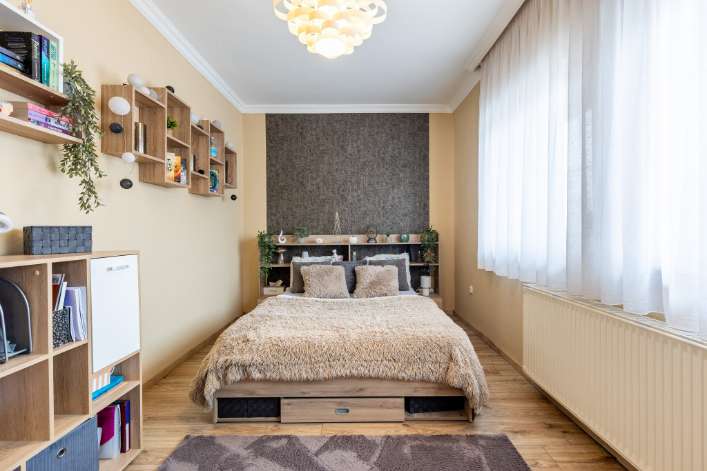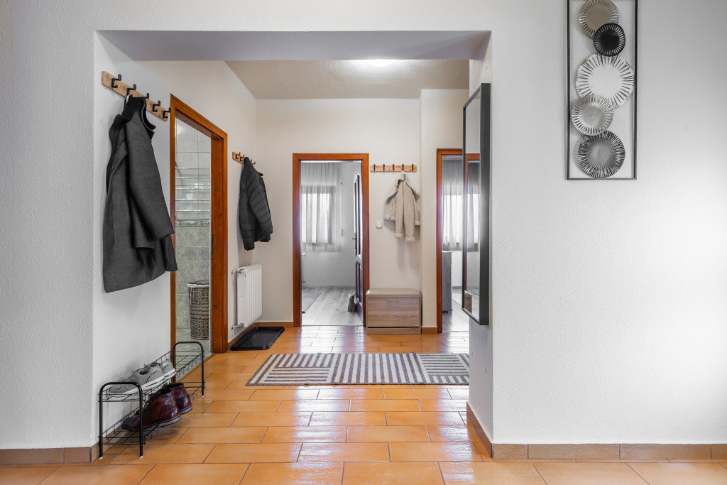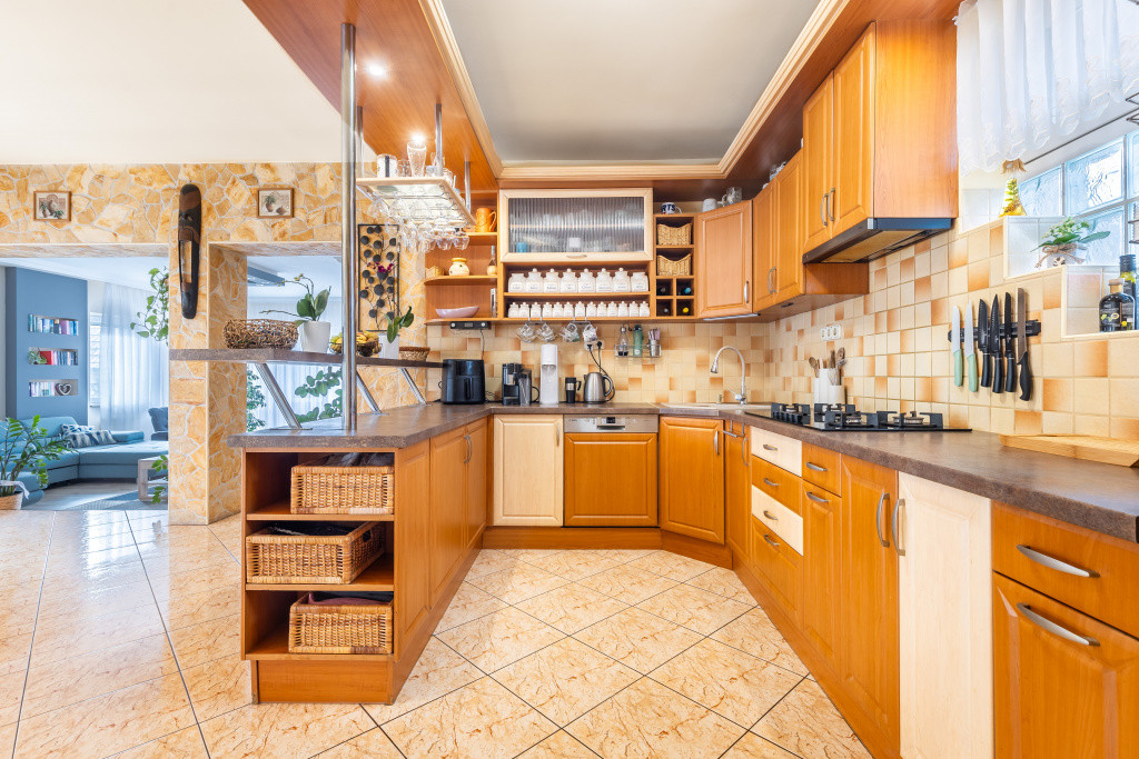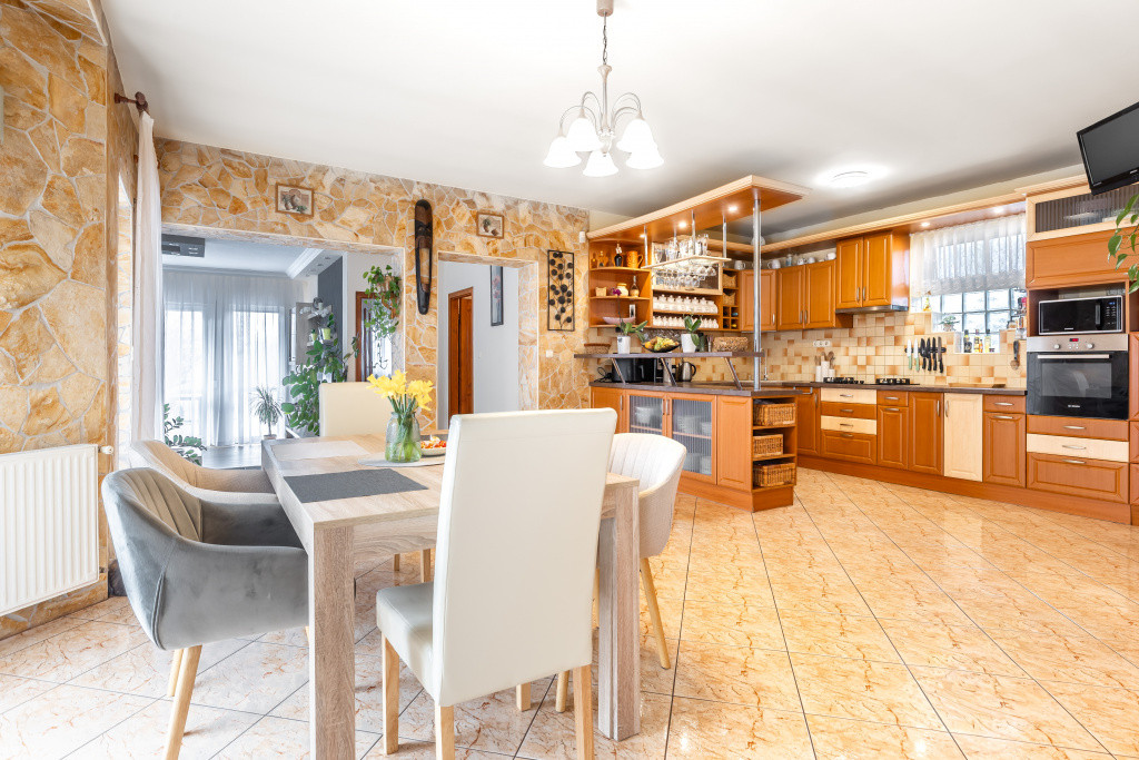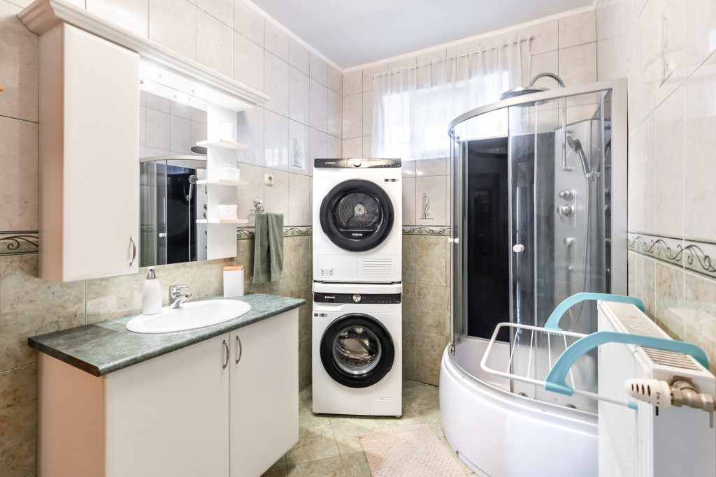 A belső elrendezés ideális családok számára: három külön nyíló szoba mellett tágas nappali és étkezős konyha alkotja a közösségi tereket, a kényelmet pedig két fürdőszoba, egy külön mellékhelyiség, kamra és gardrób növeli. A biztonságról riasztórendszer gondoskodik. Az udvaron garázs is található, valamint egy fúrt kút segíti a kert gazdaságos öntözését.