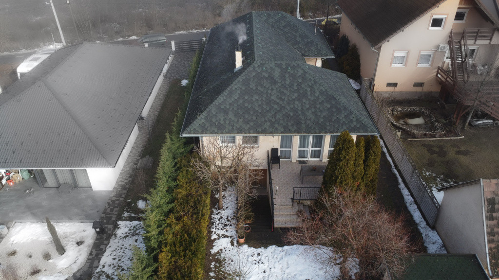 Az ingatlan téglaépítésű, falai és födéme is hőszigeteltek, a masszív betonfödémet zsindely fedés zárja le. A korszerű műanyag nyílászárók hőszigetelő üvegezéssel készültek, redőnnyel és szúnyoghálóval felszereltek. A melegről kondenzációs kombi gázkazán gondoskodik puffertartállyal kiegészítve, a nyári hűtést pedig két szobában klíma segíti. Az ingatlan 3x20A-es, valamint 380V-os áramellátással rendelkezik.