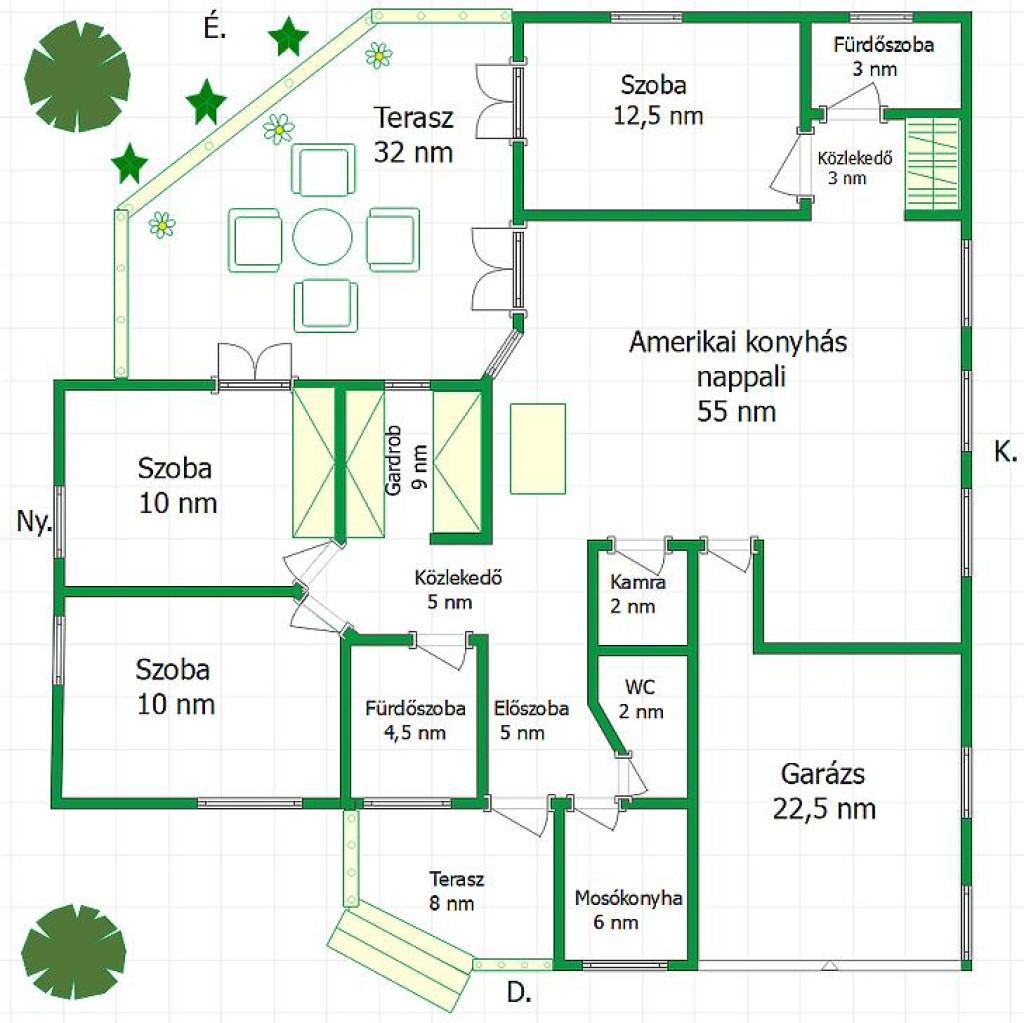 Az ingatlan átgondolt belső kialakítással rendelkezik: tágas, amerikai konyhás nappali, három hálószoba, két fürdőszoba, gardrób, mosókonyha, előszoba, kamra és külön WC.