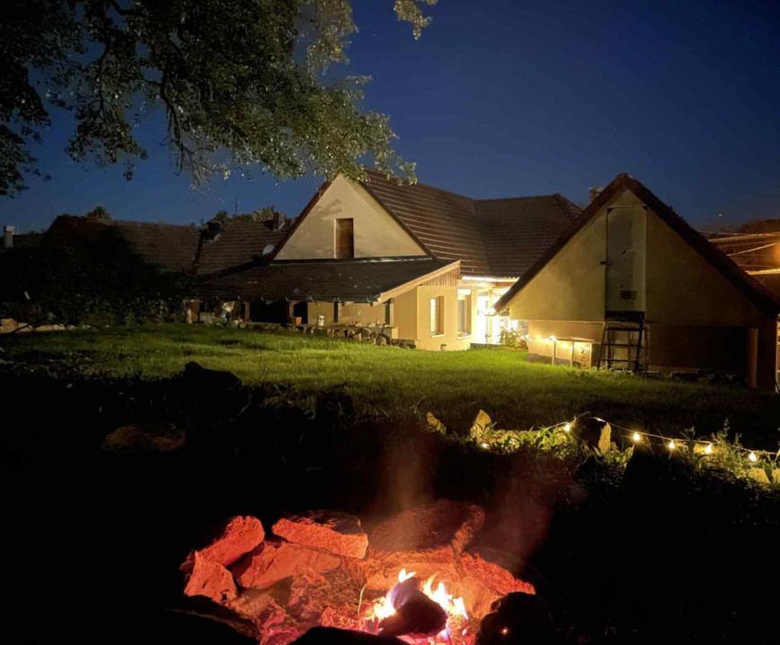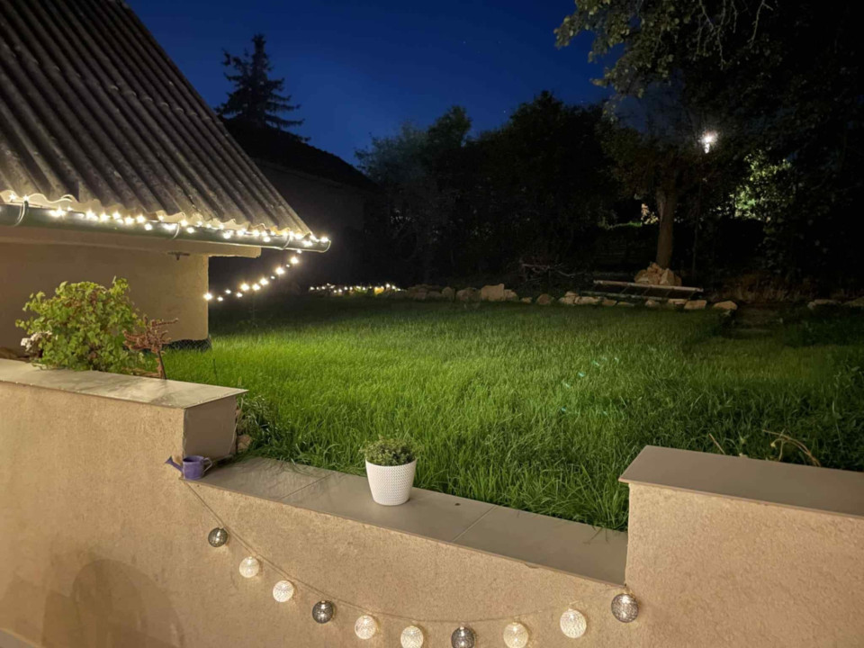 A kert rendezett, de ezen felül még nagyon sok lehetőséget rejt. A fedett, ill. nyitott teraszon, vacsorával egy pohár borral esténként a csendet hallgatva kellemesen zárul a nap.