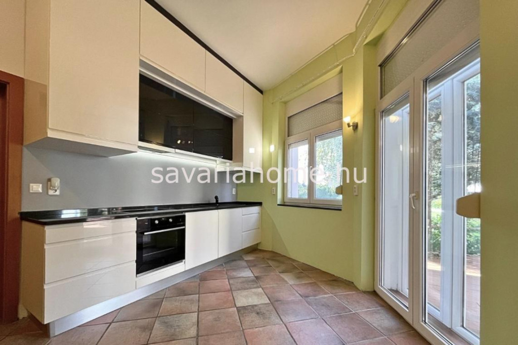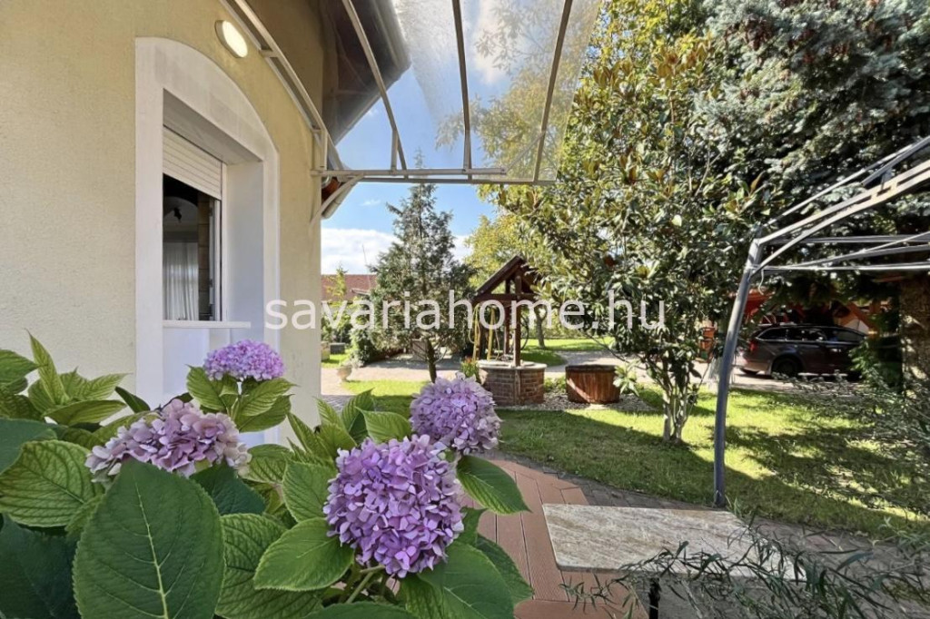 A szépen gondozott kertben csodás növények, a hátsó udvari részen magas ágyások, a szép zöld gyephez öntözőrendszer és robotfűnyíró is segíti a kényelmet és a komfortot.