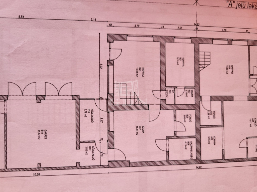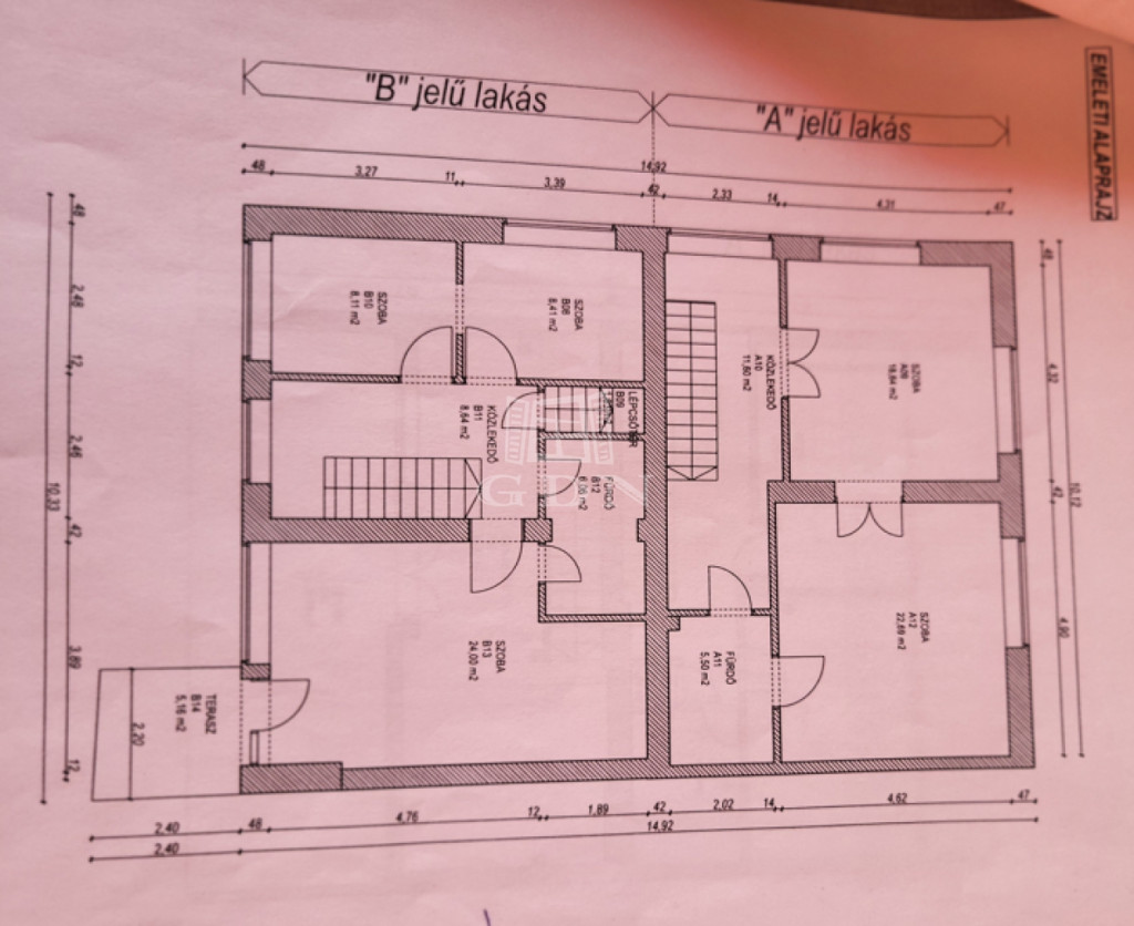 Emelet : lépcsőtér,három szoba, közlekedő, fürdő, erkély