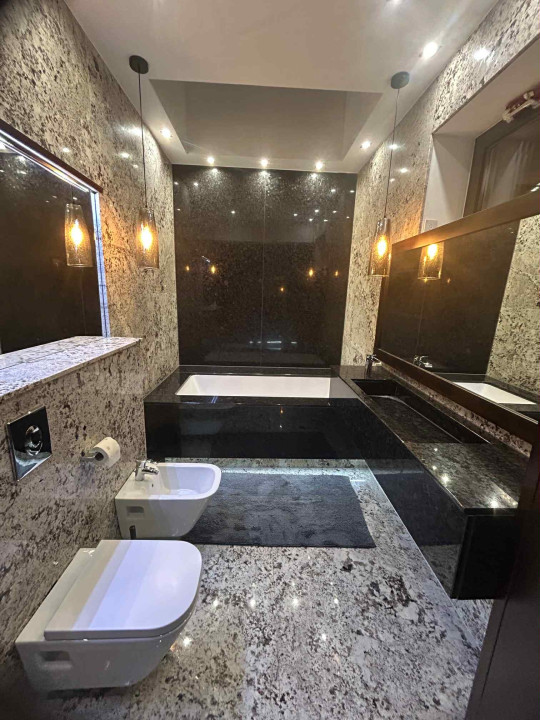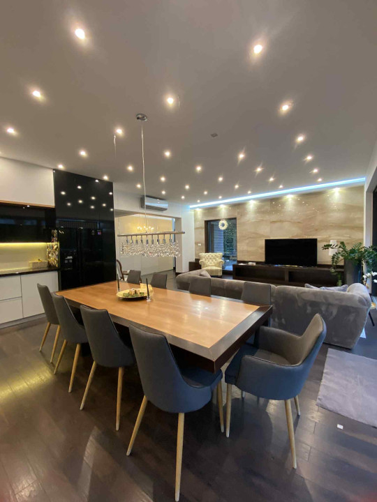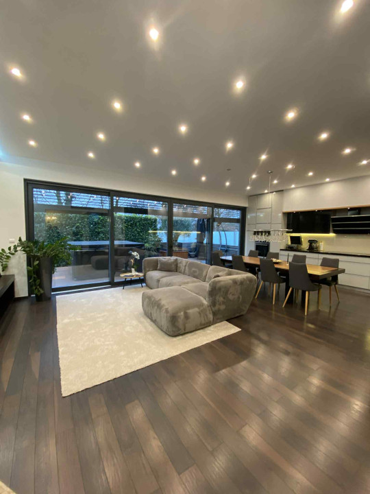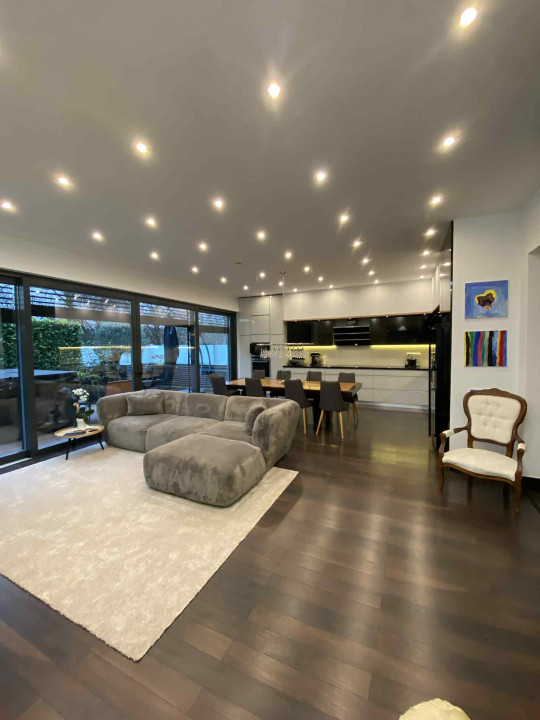 A felső szint központi eleme az 53 m²-es, nappali–étkező–konyha egység, amely közvetlen kapcsolatban áll a kerttel és a 60 m²-es terasszal. Az emeleten összesen öt szoba, valamint két, gránit burkolattal kialakított, elegáns fürdőszoba található. Az enteriőr ízléses berendezése tovább erősíti az ingatlan exkluzív jellegét.
