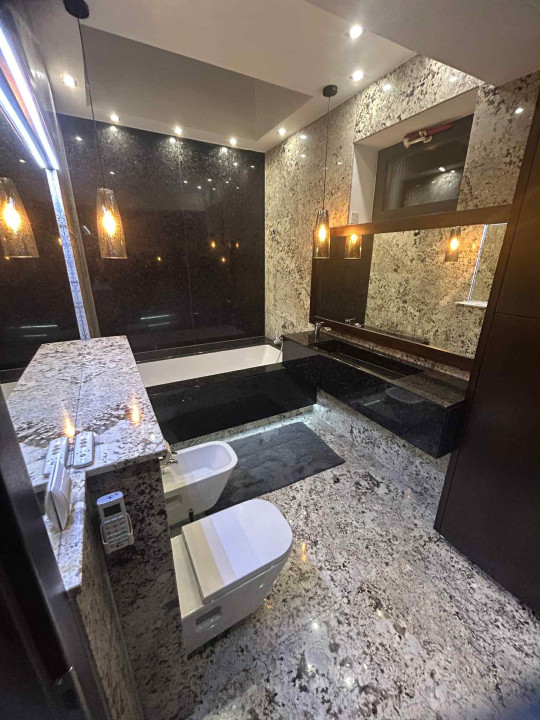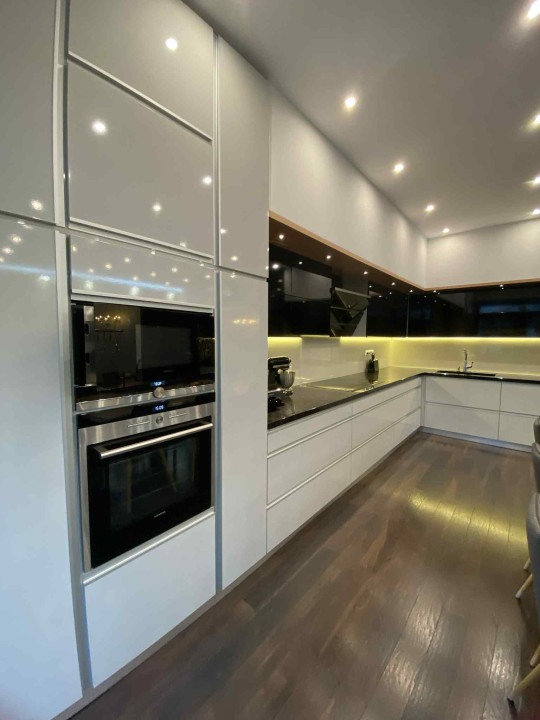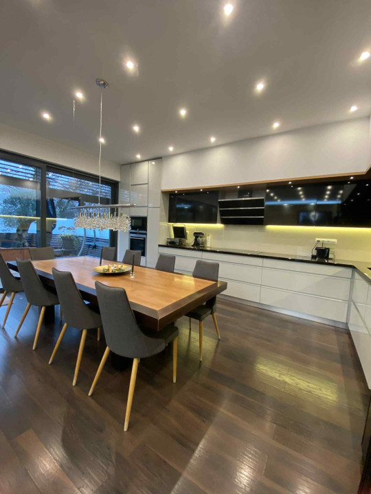 Az egyedileg tervezett konyhabútor magas minőségű anyagokból készült, gránit mosogatóval és beépített konyhai aprító rendszerrel, teljes gépesítéssel.