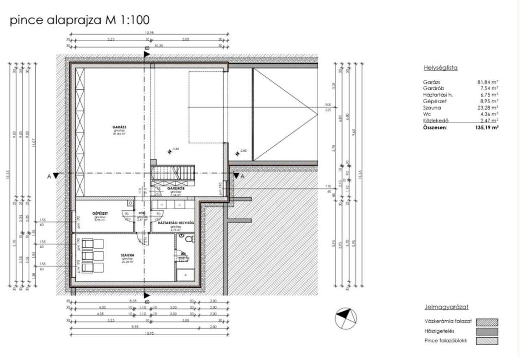 Az alsó szinten kapott helyet egy négy gépkocsi befogadására alkalmas, padlófűtéses, gránit burkolatú 82m2-es teremgarázs, továbbá gardrób, háztartási helyiség, gépészeti tér, valamint egy 24 m2-es szauna- és fürdőrész, amely jelenleg vendégszobaként üzemel.
