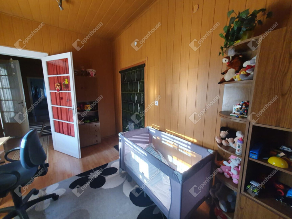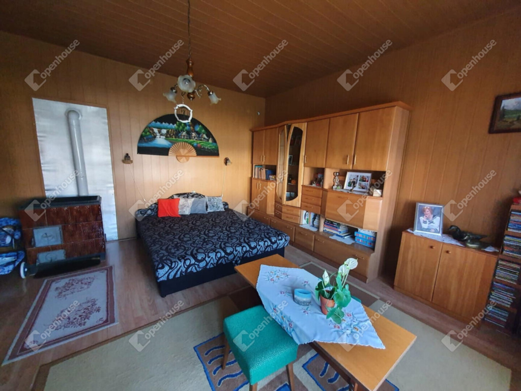 Minden helyiség laminált padlós, a nappaliban fa falburkolat ad meleg hangulatot