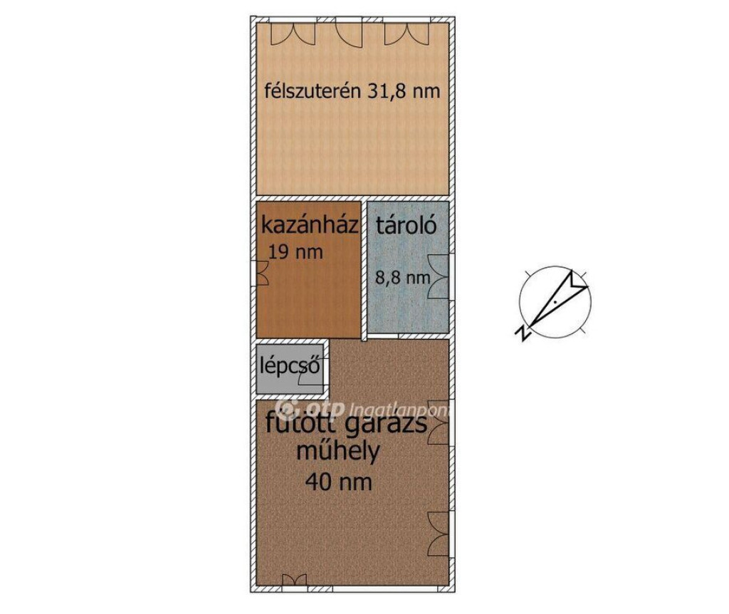 Az épület alatt teljes területen kialakított, fűthető tér, amely jelenleg garázsként és tárolóként funkcionál, de igény szerint további lakótérré alakítható.