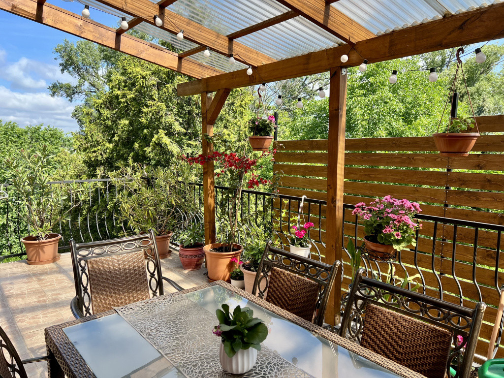 Vízparti Életérzés: Saját stég a horgászathoz vagy csónakázáshoz, és egy 60 m²-es fedett felső terasz, ahol a reggeli kávé mellett élvezheti a Duna látványát. A földszinten további 16 m² fedett terasz biztosít közvetlen kertkapcsolatot.