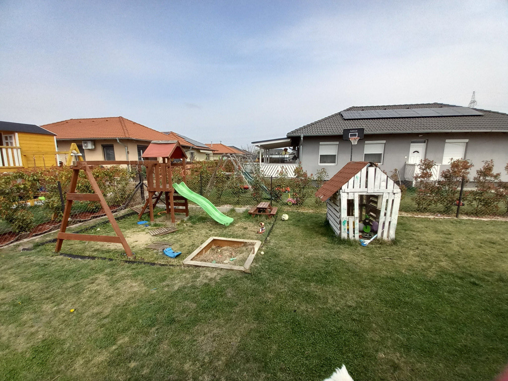 Az eladó ház kertje zöld, egy autó számára nyitott beállóval, a gyerekeknek pedig játszótérrel.