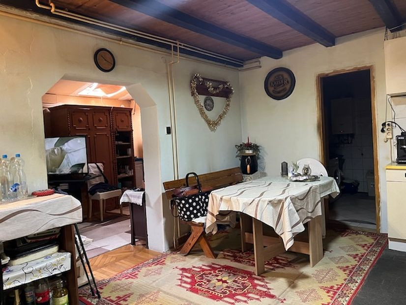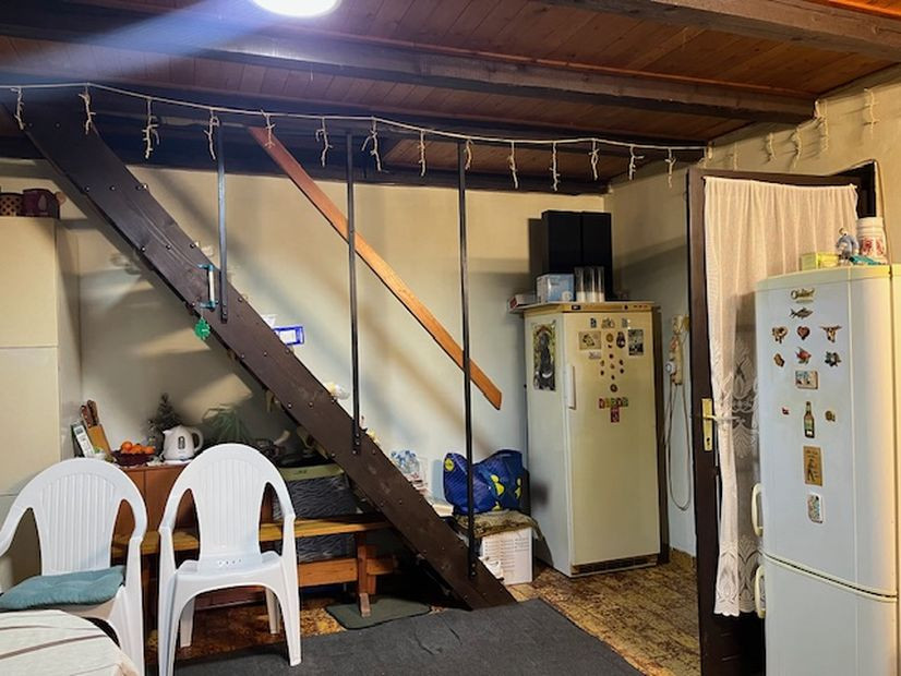 Elosztása: - előszoba, étkezős konyha, fürdoszoba, 2 szoba. Konyhából a tetőtérbe lépcső vezet, de a tetőtérbe csak a fűtés lett bevezetve, ott 2 szobát ki lehet alakítani.