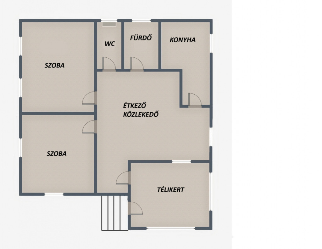 Az alsó szinten van egy előszoba mely akár téli kertként is funkcionálhat ,nappali-étkező-konyha ,fürdőszoba, WC és 2 nagy szoba.