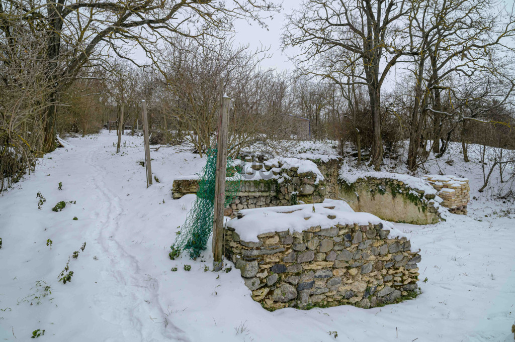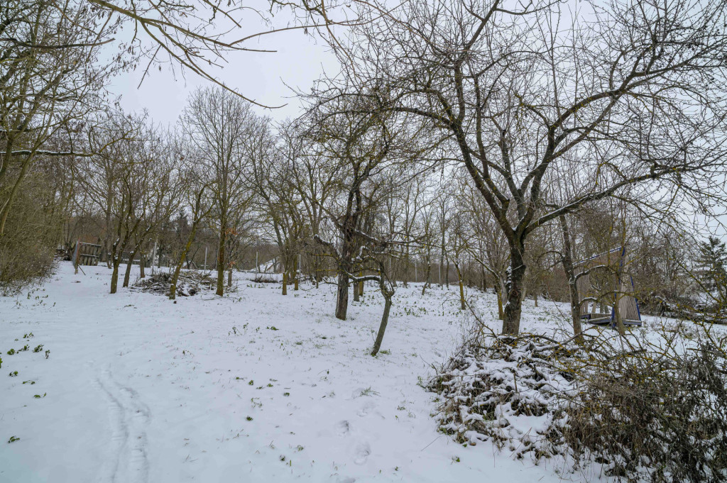 A 805 m²-es, gondozott telek gyümölcsfákkal beültetett, kiválóan alkalmas pihenésre, kertészkedésre vagy vendégek fogadására.