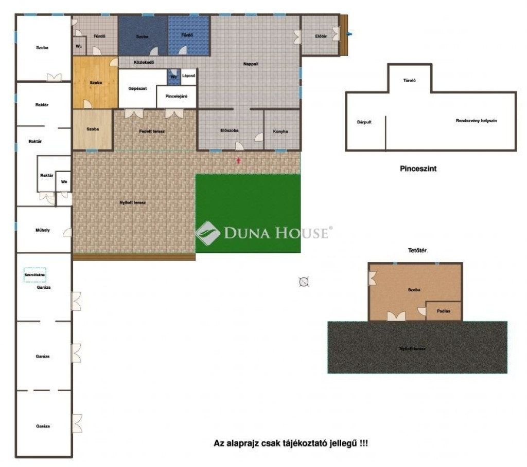 Az ingatlanhoz tartozik egy többfunkciós pince, amely három különálló részből áll. Ezek közül egy kb. 17 m²-es tároló, valamint egy 45 m²-es nagyobb helyiség, ahol bárpult és mosogató is kialakításra került, így akár családi rendezvények, születésnapok vagy baráti összejövetelek megtartására is kiválóan alkalmas.