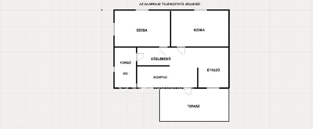 Az ingatlanban egy terasz, 2 szoba, közlekedő, konyha, étkező és egy fürdőszoba/wc található.