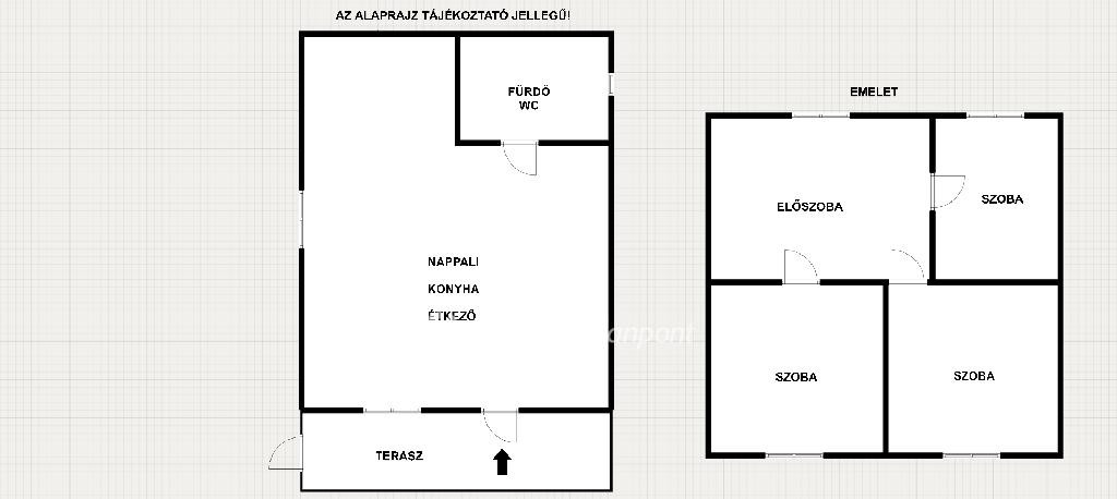 A 2 szintes ingatlanban kialakításra került egy terasz, fürdő/WC, nappali/konyha/étkező, az emeleten pedig egy közlekedő és 3 szoba.
