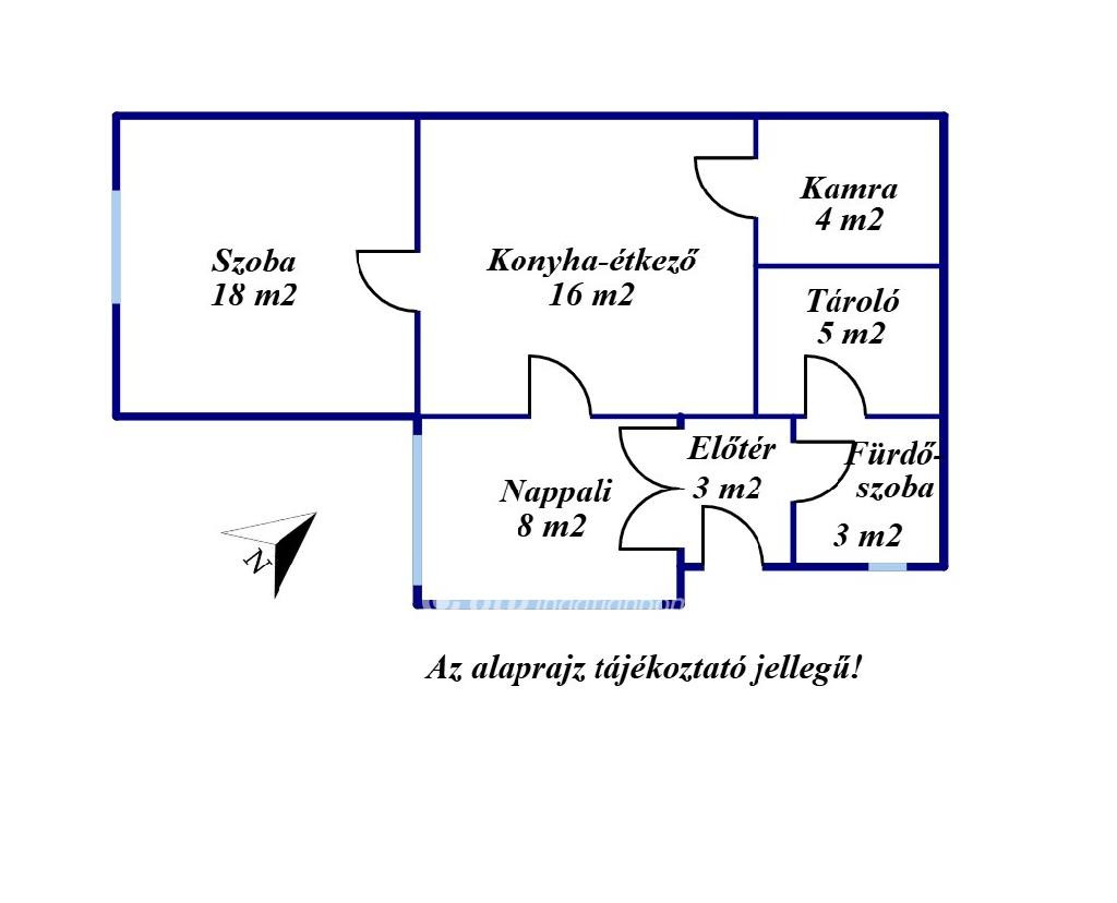 - Helyiségek: szoba, nappali, konyha-étkező, fürdőszoba WC-vel, kamra, előtér és tároló