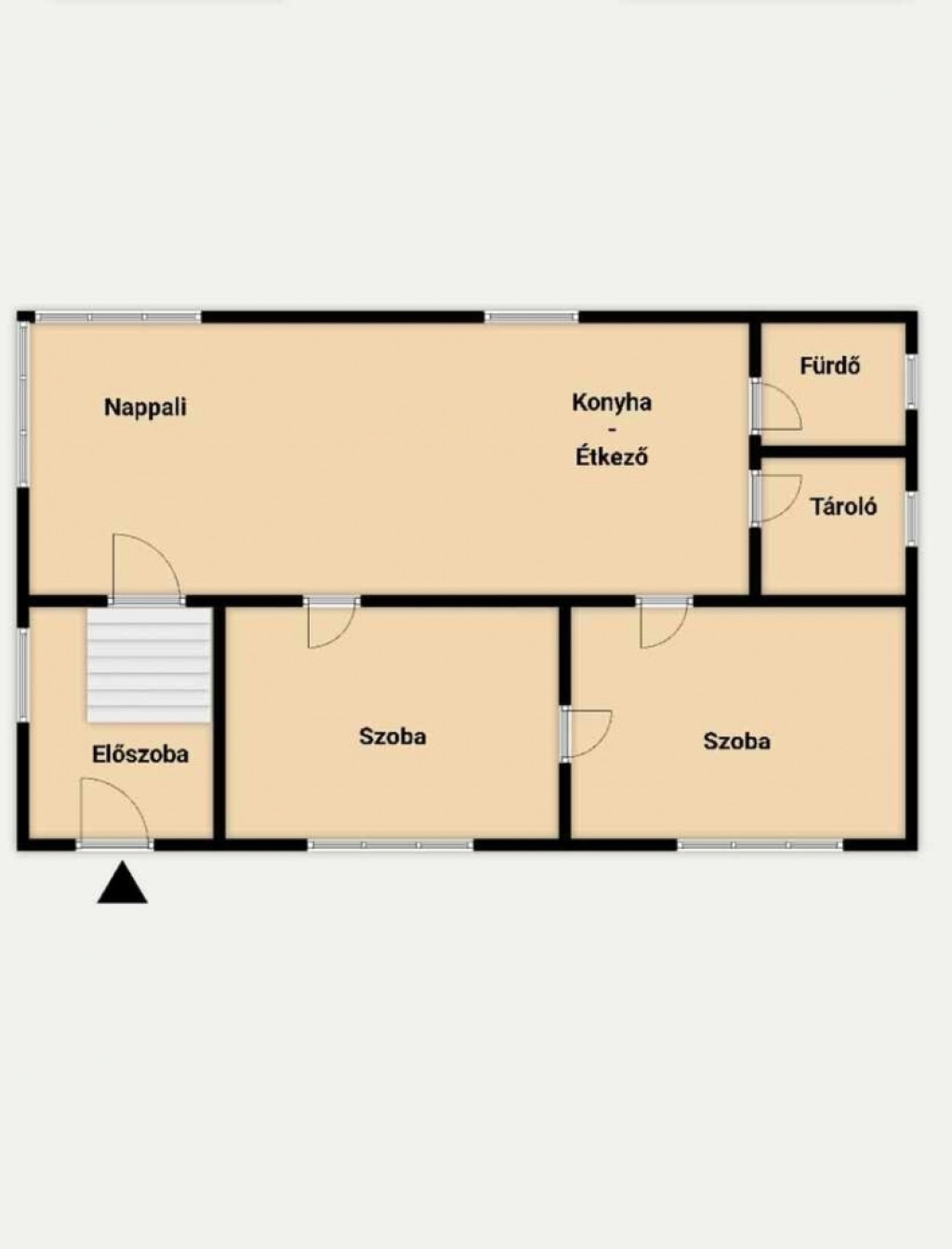 - földszintes elrendezésben, előszoba, 3 szoba, konyha, nappali, fürdőszoba és wc egyben