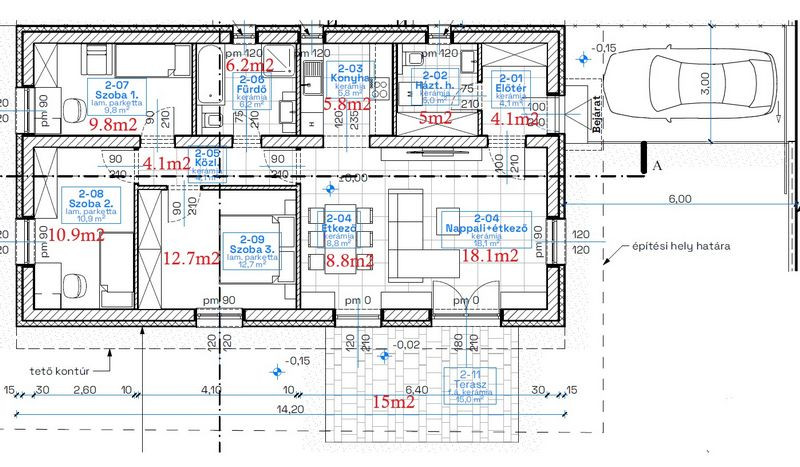 Az ingatlan felosztása (nettó 85.5m2 lakótér + terasz): előtér (4.1m2), háztartási helyiség + wc (5m2), konyha (5.8m2), étkező (8.8m2) - nappali (18.1m2), közlekedő (4.1m2), fürdőszoba + wc (6.2m2), 3 szoba (10.09m2, 12.7m2, 9.8m2), terasz (15m2).