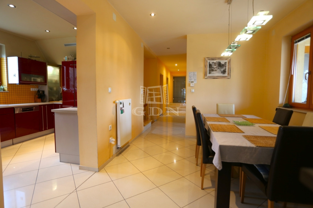 az emeleten négy világos hálószoba kapott helyet, valamint egy zuhanyzós fürdőszoba és egy különálló vizes helyiség is szolgálja a kényelmet. Ugyanitt található a garázs felett kialakított, 60 m²-es beépítésre előkészített tetőtér, amely akár egy külön bejáratú lakássá is átalakítható – ideális többgenerációs együttéléshez vagy irodai funkcióra.