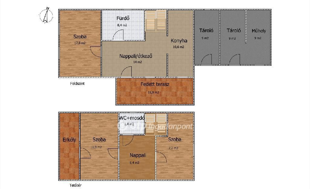 Az alsó szinten egy világos nappali-étkező, konyha, hálószoba, fürdőszoba, külön WC és egy fedett terasz biztosítja a kényelmet, míg a tetőtérben egy nappali, két hálószoba, mosdó WC-vel, valamint egy tágas, a környékre remek kilátást nyújtó erkély található. A lakótér elrendezése ideális akár nagyobb család számára is, hiszen a helyiségek jól tagoltak és funkcionálisan használhatók.