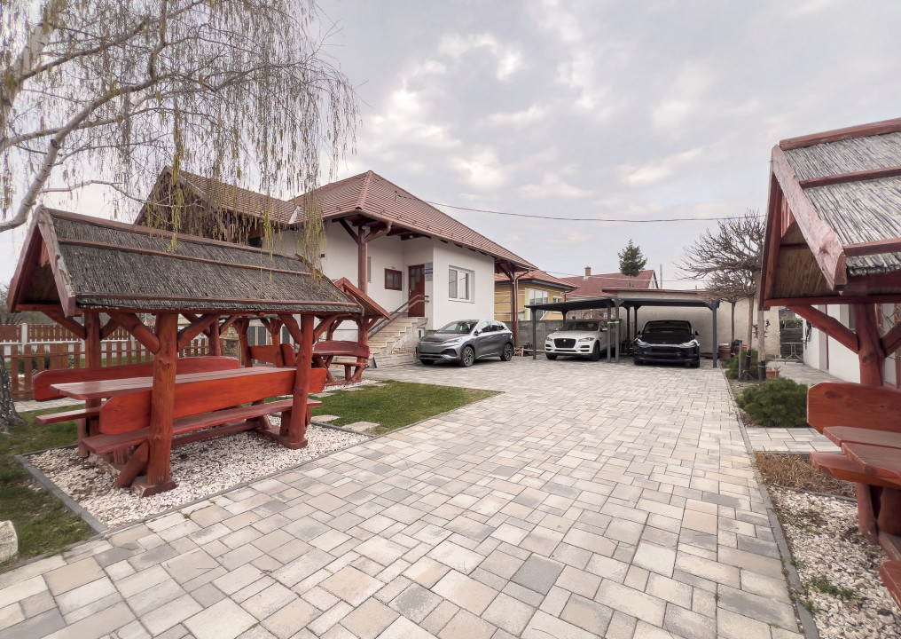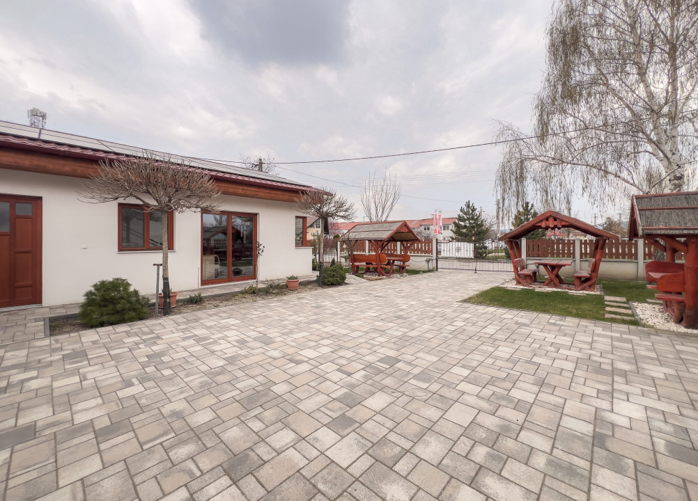 A ház előtt térkövezett beálló található, külön fedett gépkocsibeállóval, a füvesített kertben külön üvegház gondoskodik a veteményesről, a kert többi része gondozott, diszfákkal és örökzöld tujákkal beültetett. A ház körbe térkövezett és táviránytóval ellátott, kovácsolt vas kerítéssel körbekerített.