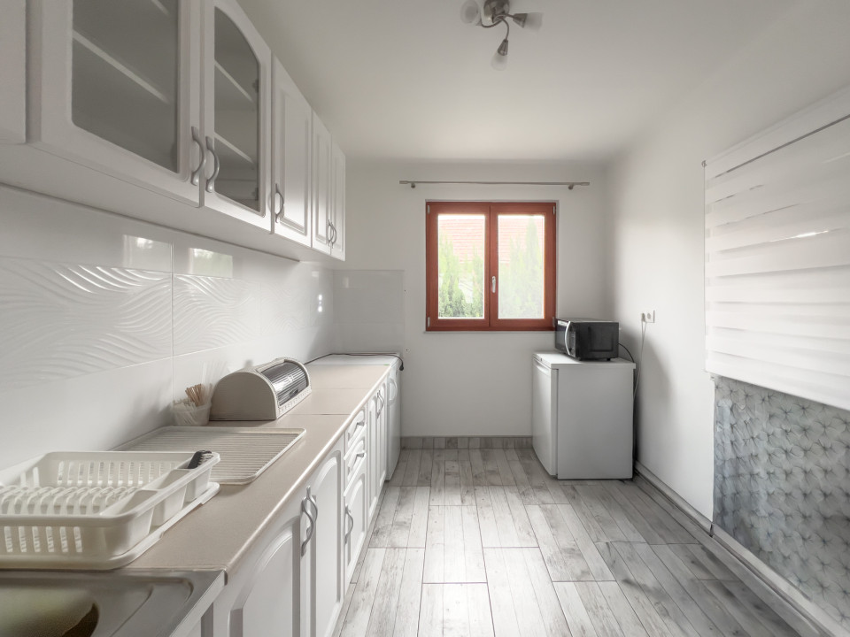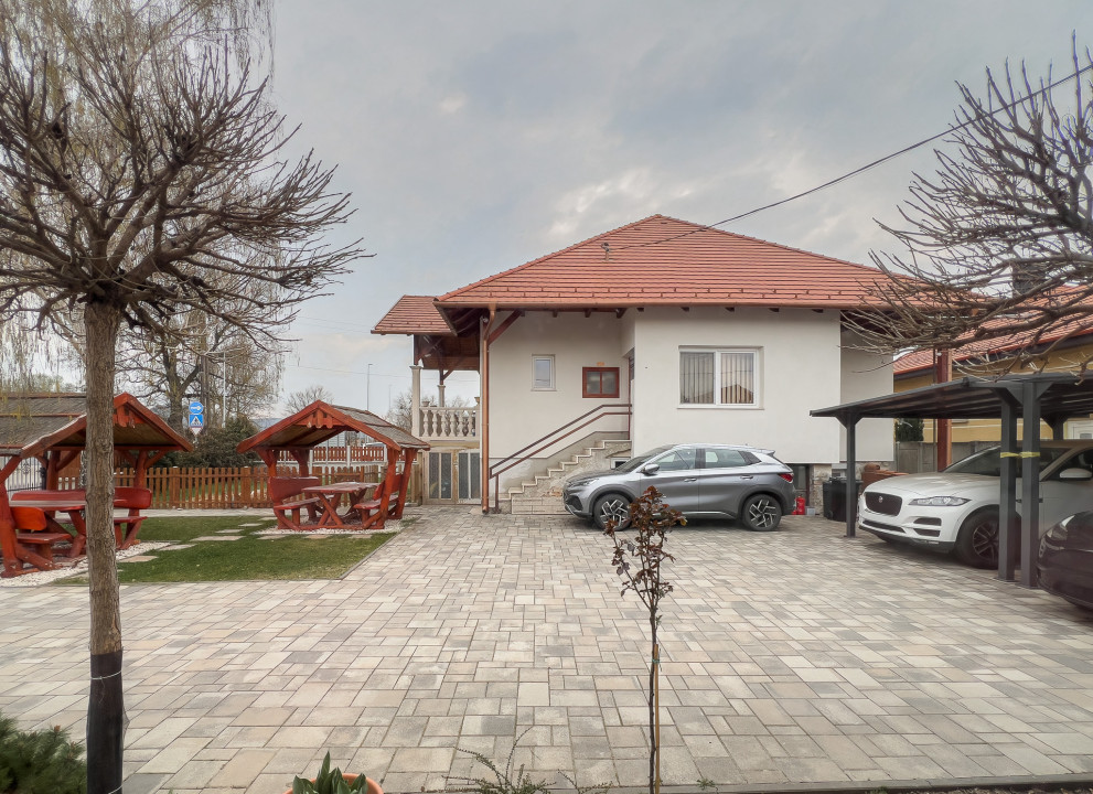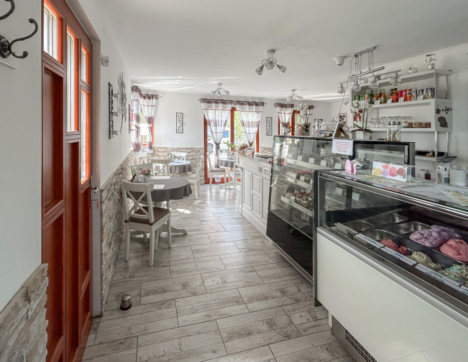 A lakóháznak alkalmas ( eddig cukrászdaként működő) lakóingatlan helyiségei: nagy nappali , külön konyha nappali felé néző un. kiadó ablakkal, hálószoba zuhanyzós fürdőszobával, háztartási helyiség ( 1 db wc-vel) , 2 db különálló wc, amelyikből bármelyik fürdővé is alakítható.