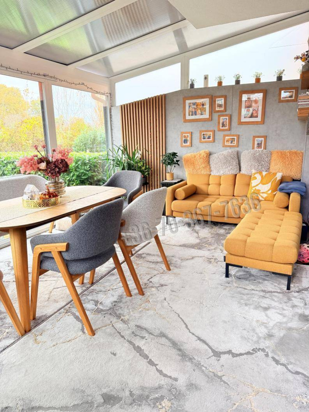 Az utólag kialakított télikert elektromos padlófűtéssel és hűtő-fűtő klímával egész évben tökéletes pihenőhely – akár egy jó kávé mellé reggel, akár egy pohár bor mellé este.