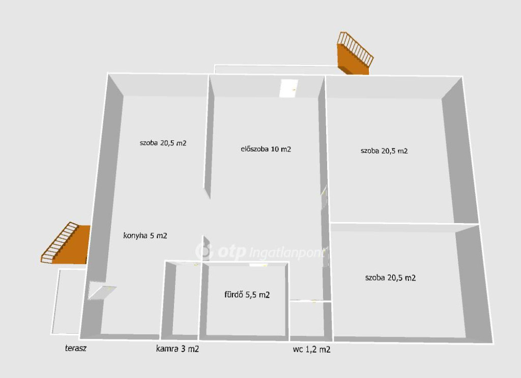 földszinten, 3 szoba, közlekedő, könyha, wc, fürdő és kamra található 2 terasszal. Terasz nélkül 70 m2