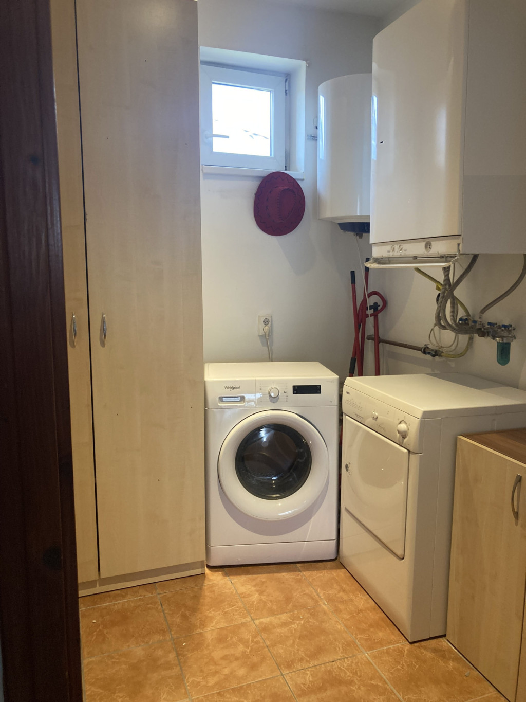 A víz melegítéséről és a ház melegéről kombi gázkazán gondoskodik, valamint a radiátorok a nappaliban lévő fatüzelésű kandallóval is fűthetők.
