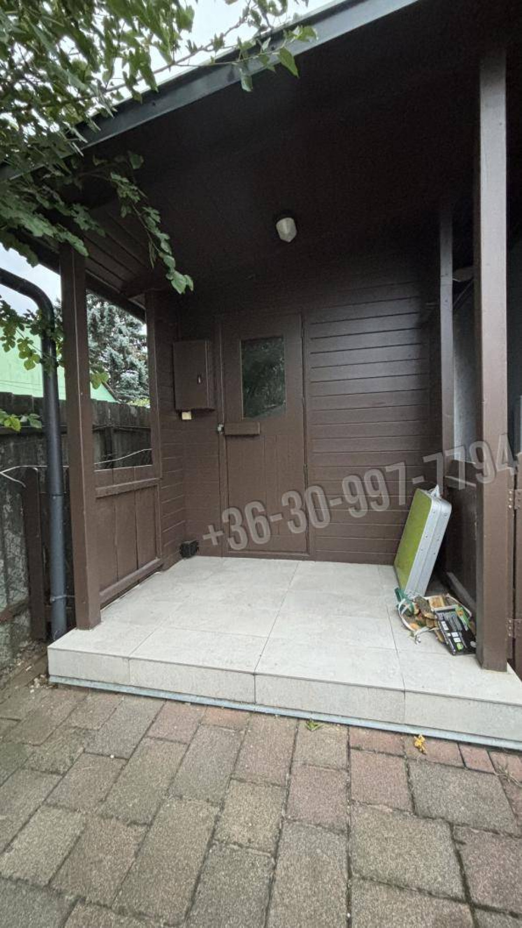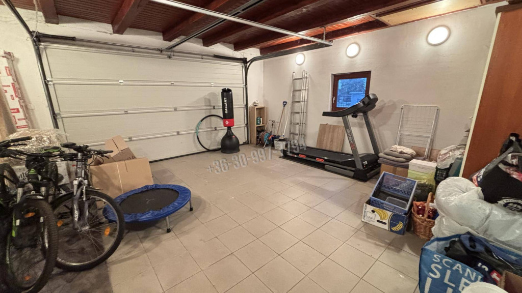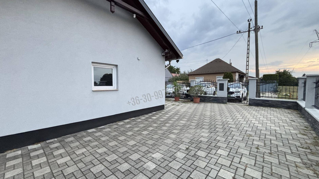 -garázs (28 m²) + több autó számára térkövezett beálló