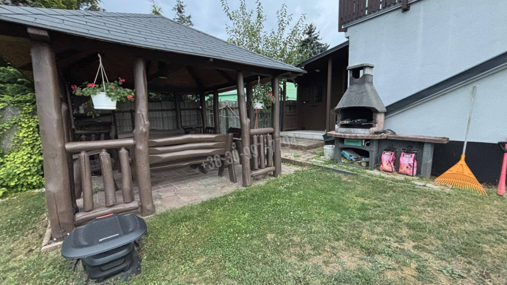 -nagy, zöld kert filagóriával, kőgrillel és BBQ-lehetőséggel