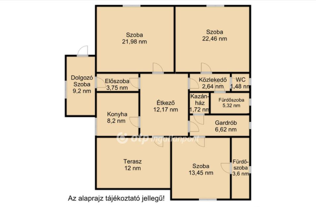 konyha-étkező, közlekedő, 3 külön nyíló szoba, előszoba, dolgozó szoba, gardrób, kazánház, 2 fürdőszoba, terasz