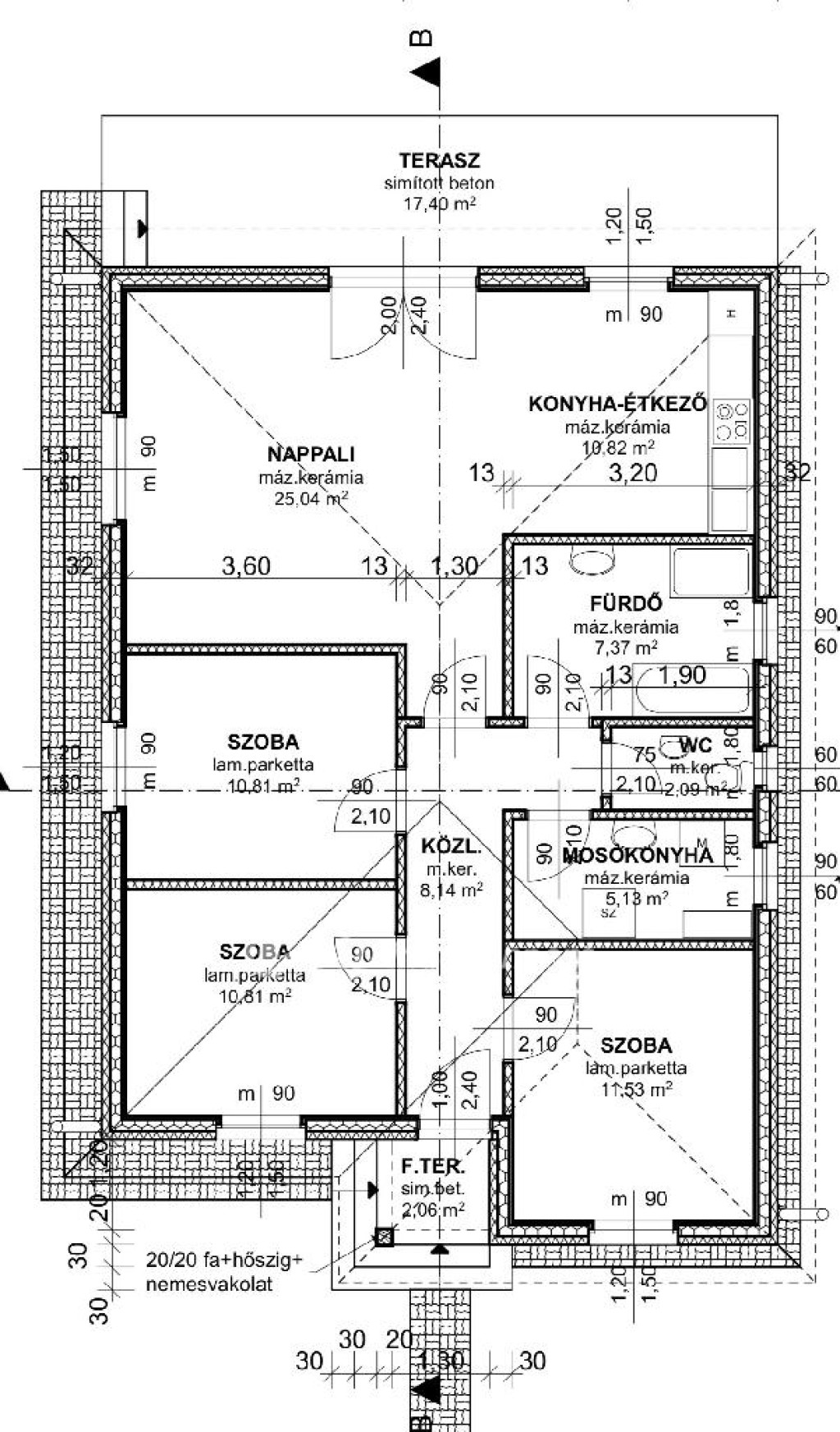 - tető: kontyolt nyeregtető, 25°, Bramac Római Protector cserép