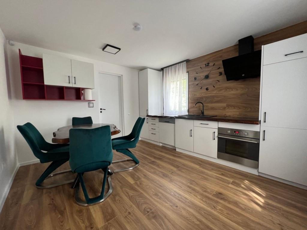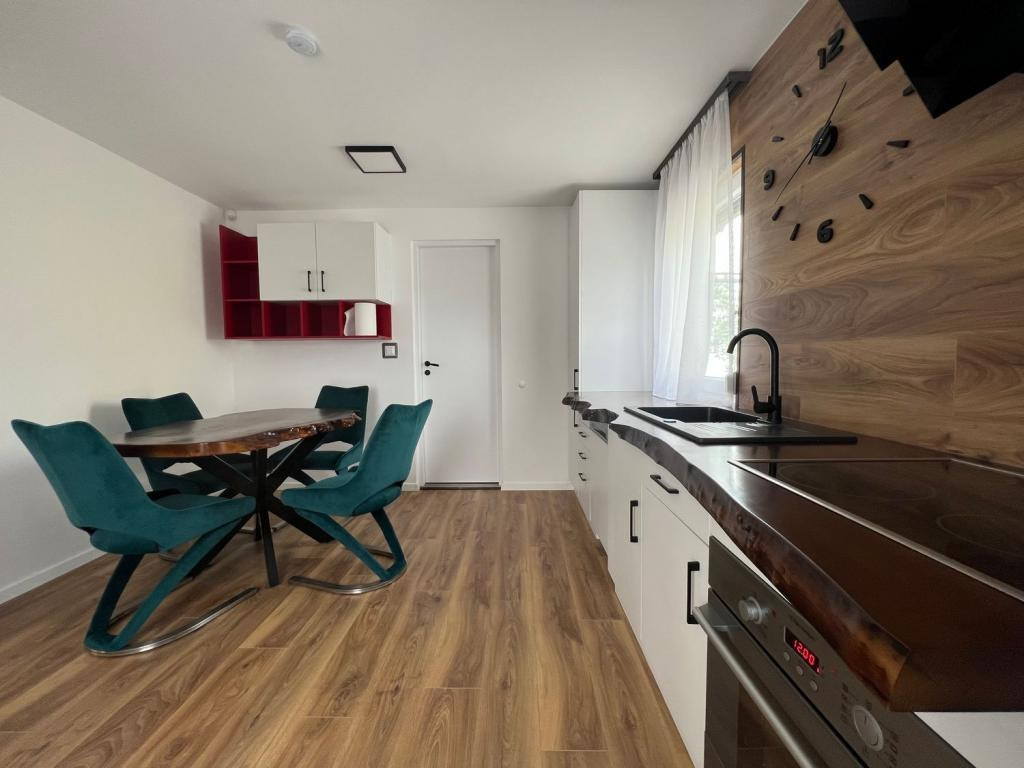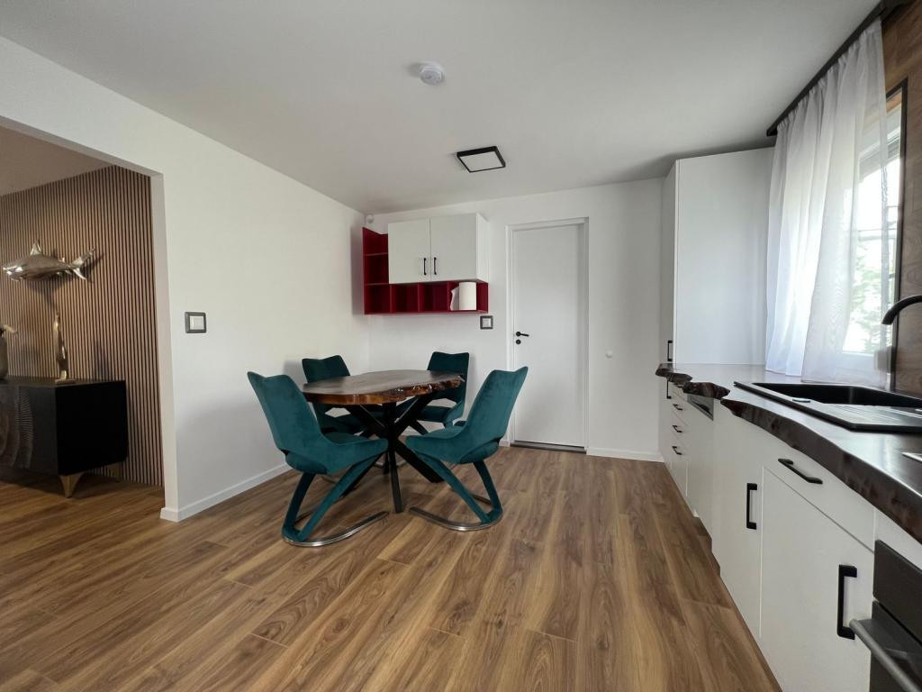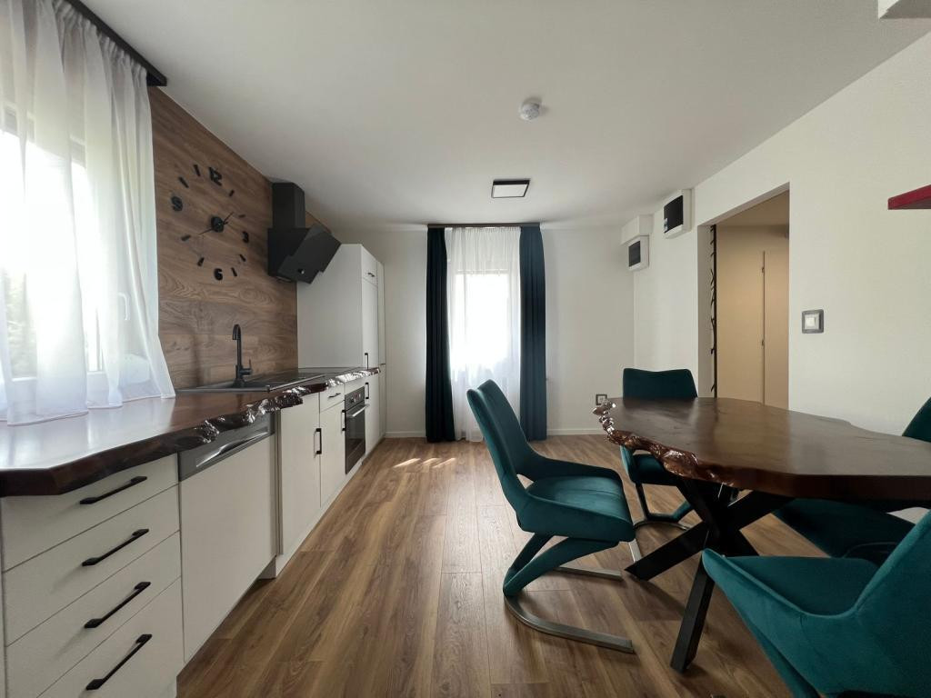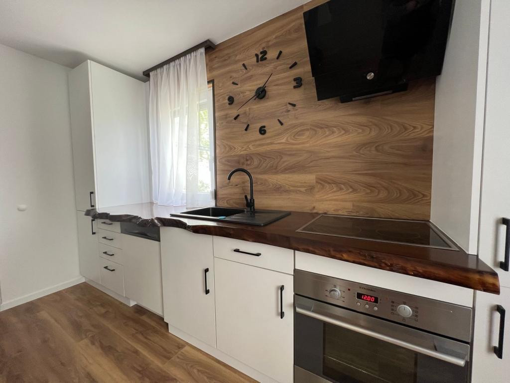 Gépesített konyha (hűtő, mosogatógép, sütő, főzőlap) különleges csontos tölgy munkalappal