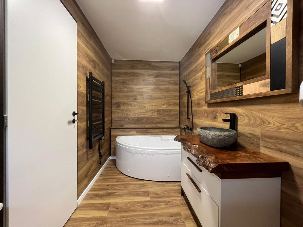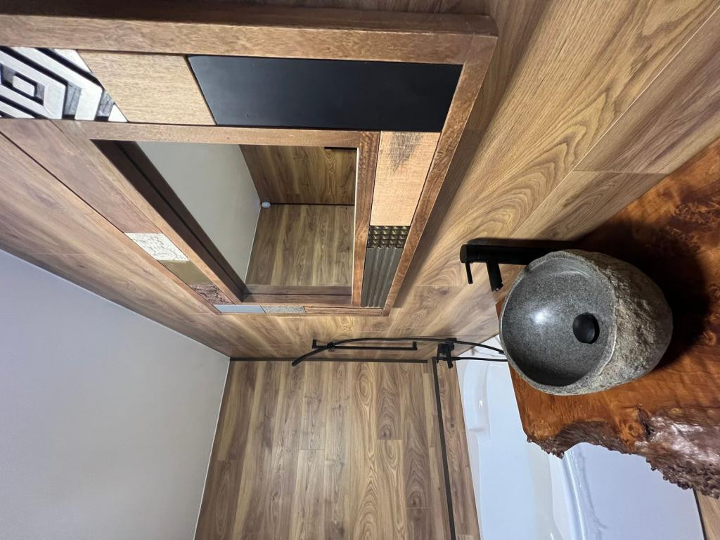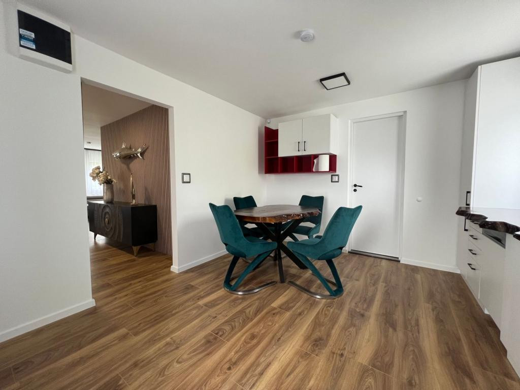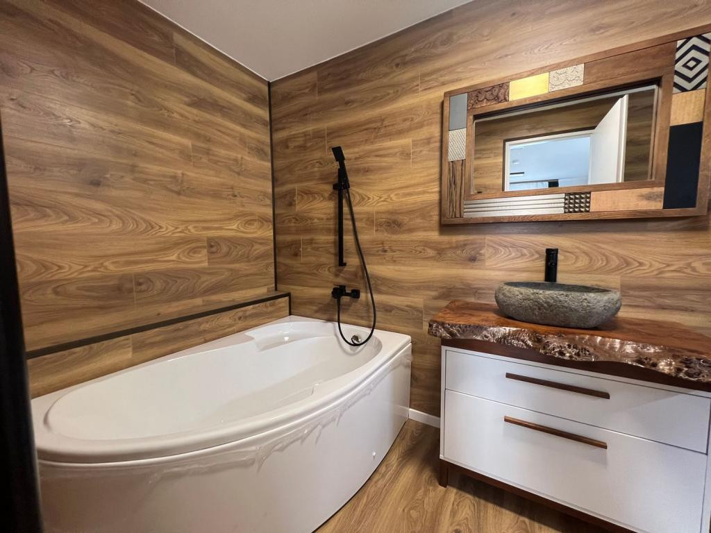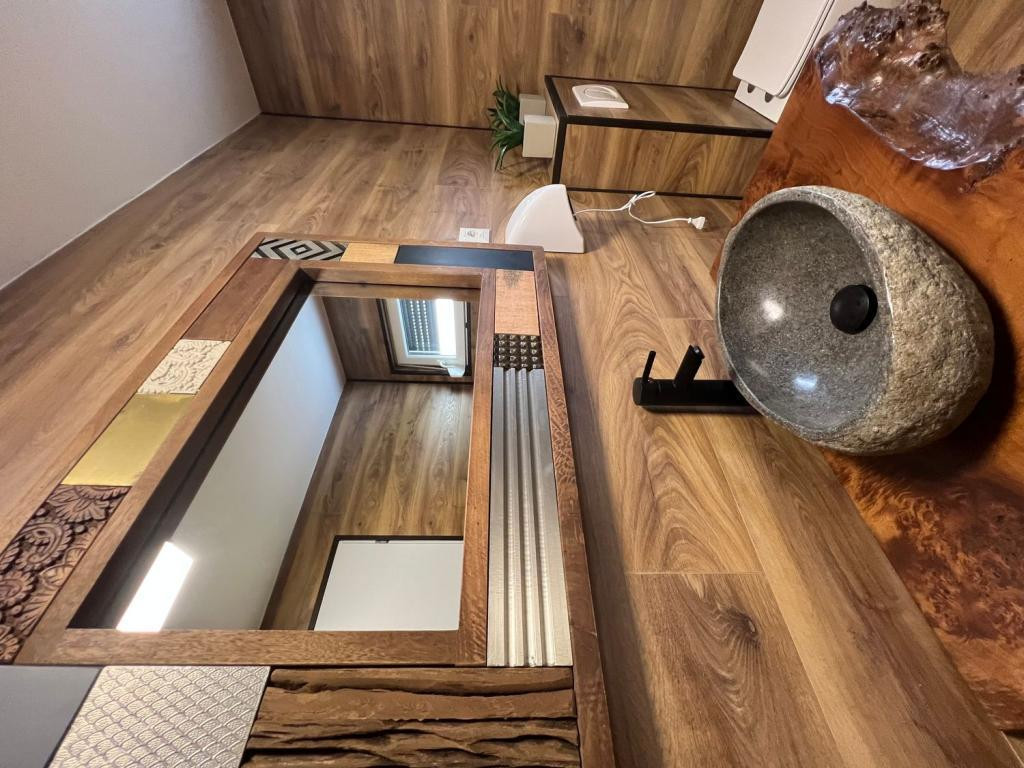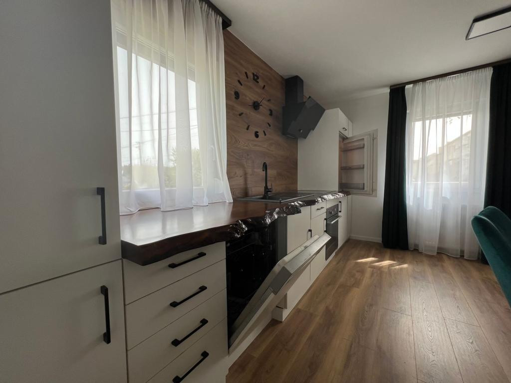 Gépesített konyha (hűtő, mosogatógép, sütő, főzőlap) különleges csontos tölgy munkalappal