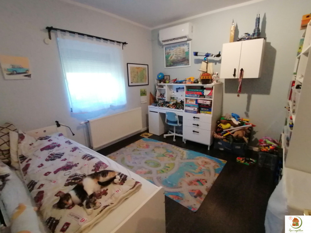 A ház elosztása egy három gyerekes családnak is tökéletes: hatalmas közösségi tér, ettől jól elkülönülve négy hálószoba, két fürdőszoba, háztartási helyiség és külön wc is rendelkezésre áll, összesen 131 m2-en. Ehhez kapcsolódik közbvetlen átjárással a 40 m2-es, kétállásos garázs, ahol tárolóhely is akad bőven.