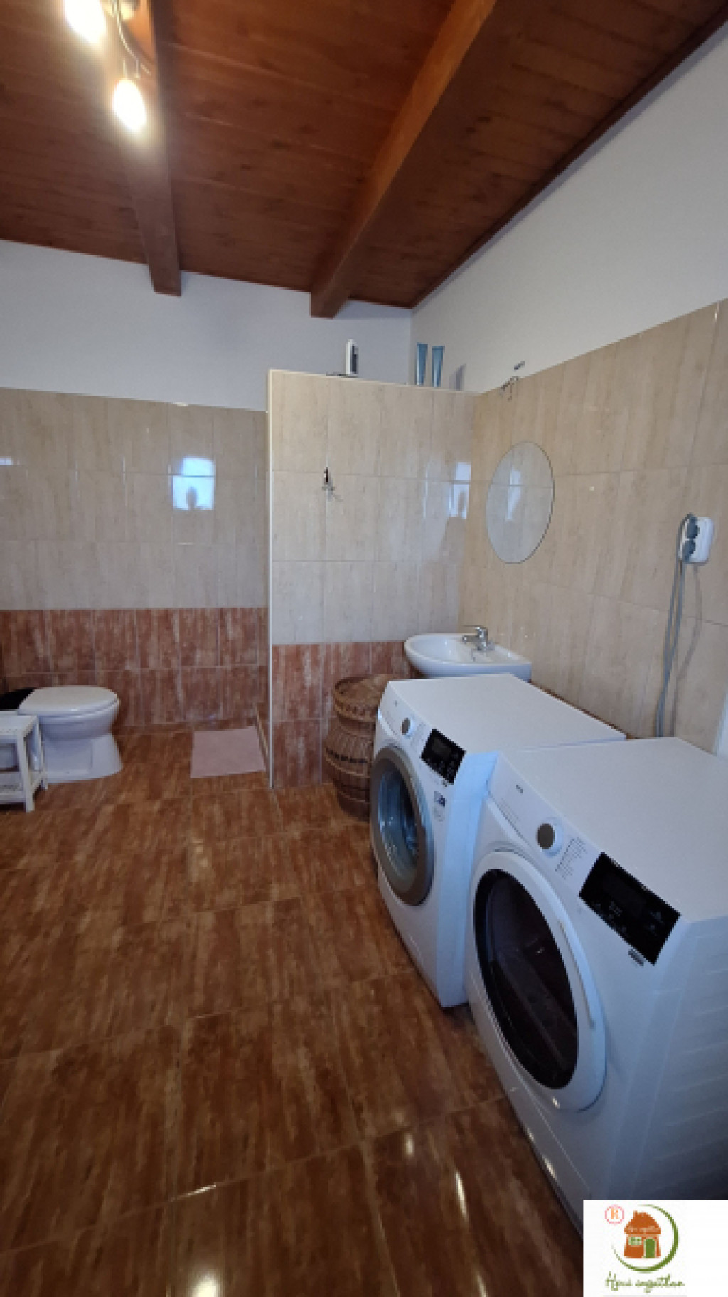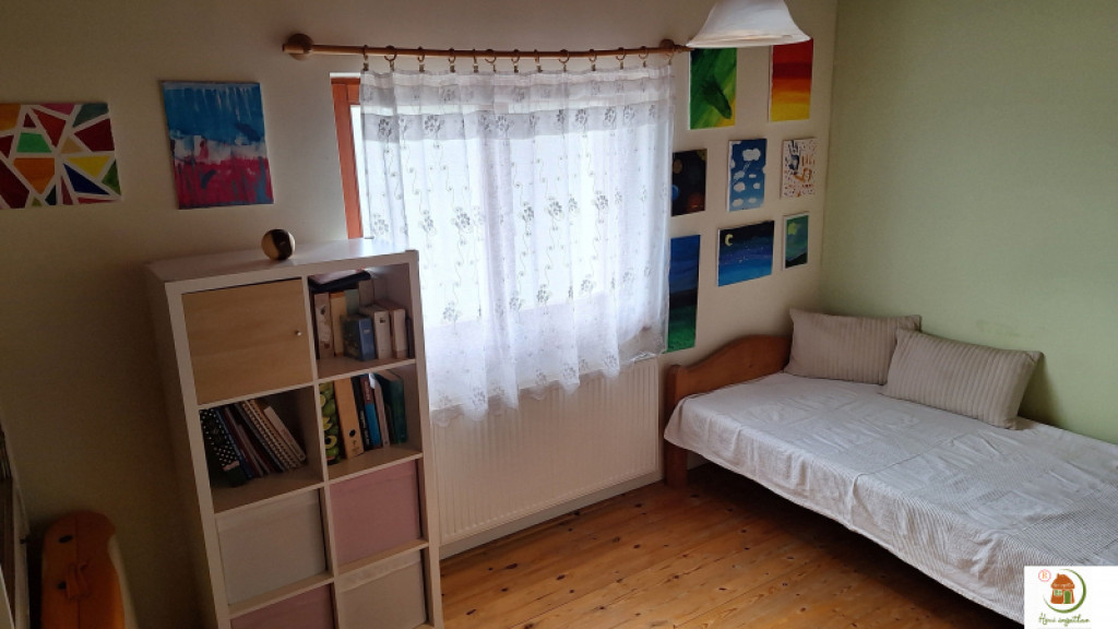 A földszinten az előszobából nyílik az egylégterű, amerikai konyhás nappali barátságos cserépkályával. Külön wc és egy hatalmas tároló is van ezen a szinten, amely akár lakó célra vagy irodának, műhelynek is kialakítható. A három hálószoba, a kádas fürdőszoba és a háztartási helyiség az emeleten található.